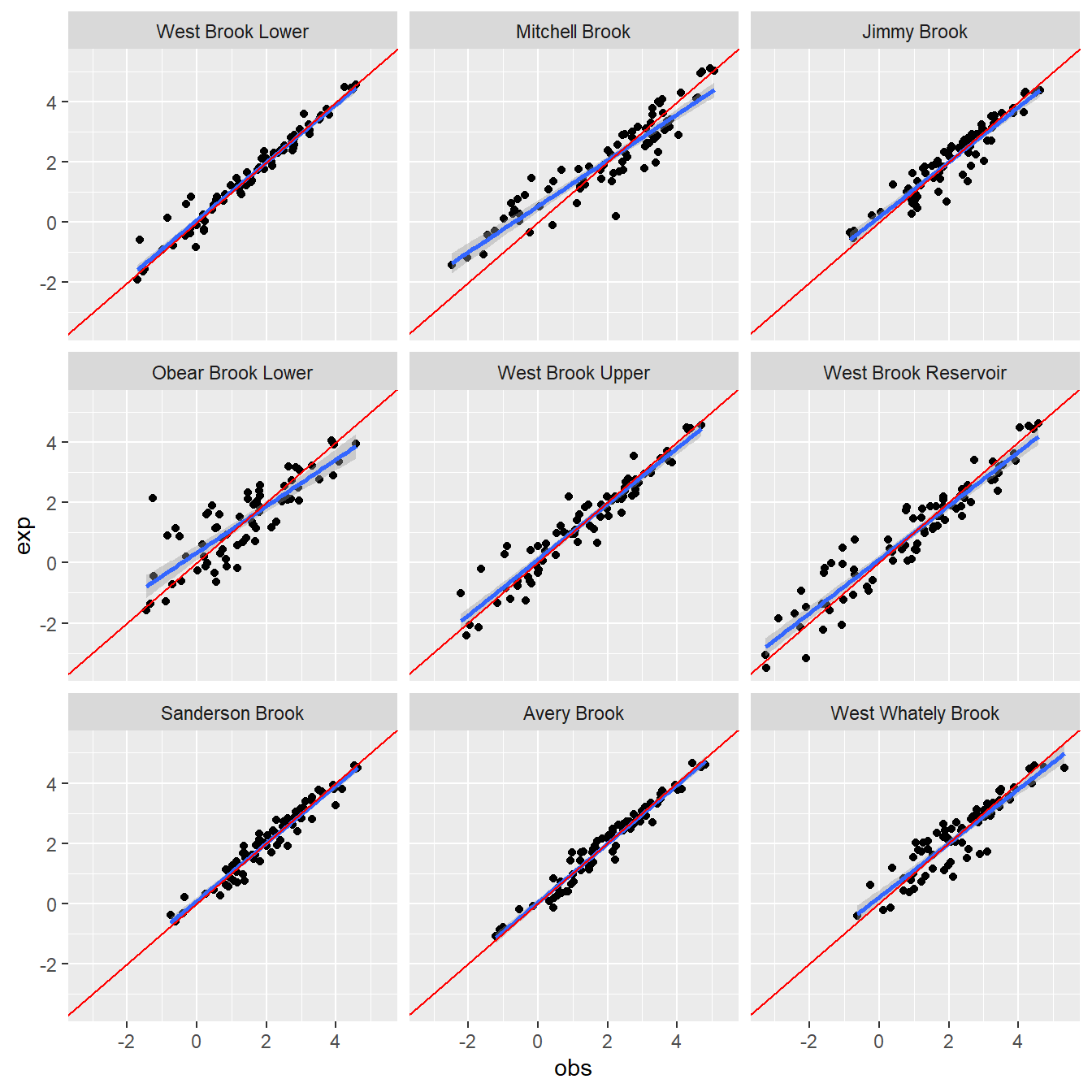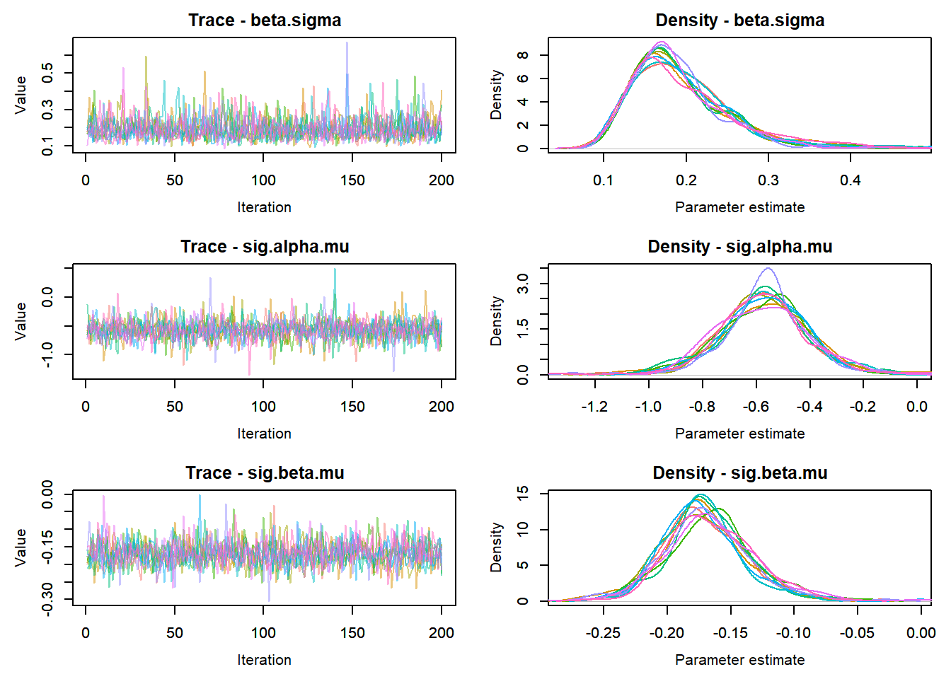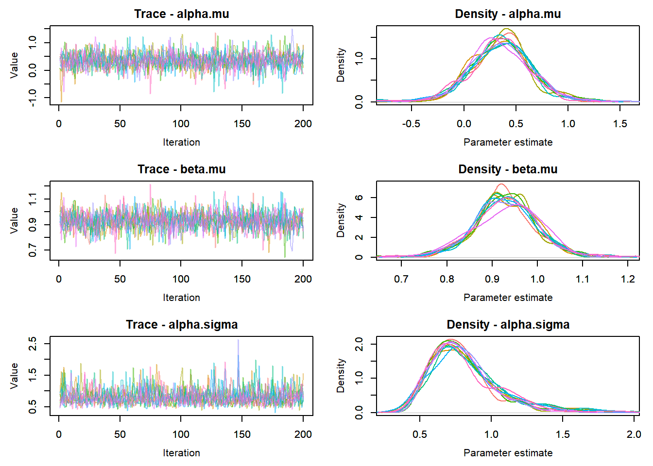 # vector of QG for predictionndiff <-100QGvec <-seq(from =min(dat$yield_big_cum_log), to =max(dat$yield_big_cum_log), length.out = ndiff)# gather data for JAGSjags.data <-list("nObs"=dim(dat)[1], "nSites"=length(unique(dat$site_name_cd)), "sites"= dat$site_name_cd, #"indev" = dat_wb2$isevent,"Qg"= dat$yield_little_cum_log, "Qg2"= dat$yield_little_cum_log, "QG"= dat$yield_big_cum_log, "QGvec"= QGvec, "nDiff"= ndiff)# parameters to monitorjags.params <-c("alpha", "beta", "alpha.mu", "beta.mu", "alpha.sigma", "beta.sigma", "sig.alpha", "sig.beta", "sig.alpha.mu", "sig.beta.mu", "sig.alpha.sigma", "sig.beta.sigma", "ag.alpha", "ag.beta", "ag.sig.alpha", "ag.sig.beta","diff", "predlg", "loglik", "loglik2", "mu", "Qg", "portfolio1", "portfolio3", "atten3", "attenObs")# run in jagsmod_0 <-jags.parallel(data = jags.data, inits =NULL, parameters.to.save = jags.params,model.file ="C:/Users/jbaldock/OneDrive - DOI/Documents/USGS/EcoDrought/EcoDrought Working/EcoDrought-Analysis/Big G Little g/JAGS Models/GgMod_Events_2.txt",n.chains =10, n.thin =20, n.burnin =1000, n.iter =5000, DIC =FALSE)# saveRDS(mod_0, "C:/Users/jbaldock/OneDrive - DOI/Documents/USGS/EcoDrought/EcoDrought Working/EcoDrought-Analysis/Big G Little g/JAGS Models/Fitted models/GgMod_Events.rds")