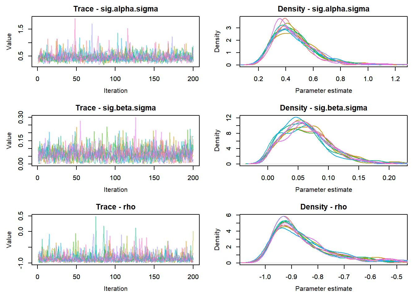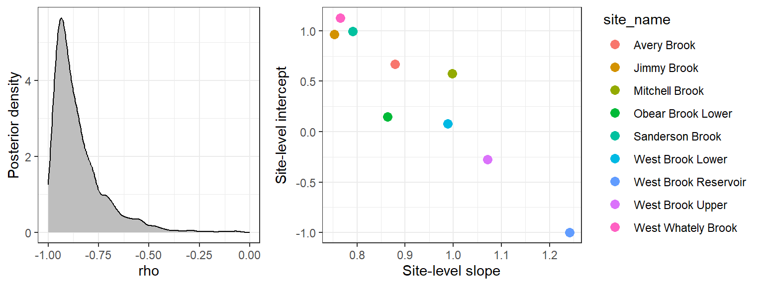 rho: correlation between site-leve intercepts (alpha) and slopes (beta)