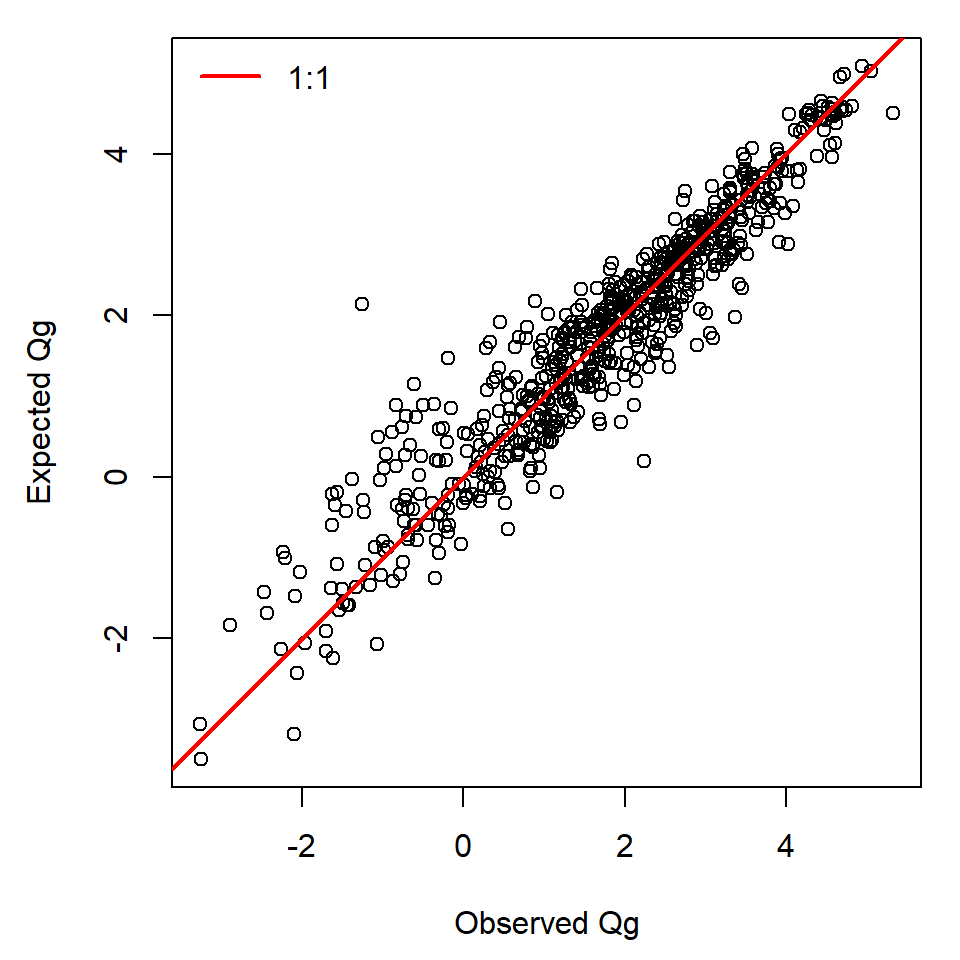 Based on results above, there does not appear to be any significant difference in the G-g relationship for event and non-event periods. Therefore, do not include random intercepts/slopes (by event/non-event) in the model. Previously, I tried to estimate the G-g differences using an intercept model, with the magnitude of difference a function of water availability. However, when Q = Qg, this simplified to a linear regression between Qg (dependent var.) and QG (independent var.), which is ultimately what is of interest. I estimate this regression model below:
