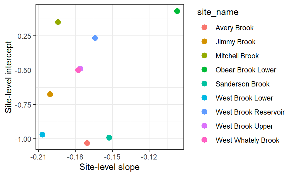 Slopes and intercepts are negatively correlated (this is not unexpected, and explains the attenuation/wedge shape of the data). As noted in Gelman and Hill, the strength of the correlation between slopes and intercepts is sensitive to how the data is centered (or not). Currently, data span 0 (in log space), so this isn’t really an artifact of the issues mentioned in Gelman and Hill (although if we mean centered the data this relationship does weaken slightly). It may actually make the most sense to force the intercept to be at the lowest value of log(G) (i.e., add min(log(G)) to all data, G and g). Intercepts would then represent the maximum expected variation in g during periods of lowest water availability. Alternatively, we could force the intercept to be at the highest valyes of log(G) (i.e., subtract max log(G) from all data) and test for random vs. fixed intercept (as suggested by Ben). Random intercepts would suggest that we still do see site-level variation in g when overall flows are high, whereas a fixed intercept would suggest minimal/no site-level variation in g at high flows. However, we do ultimately need to the slope/intercept correlation structure to do the variance decomposition.