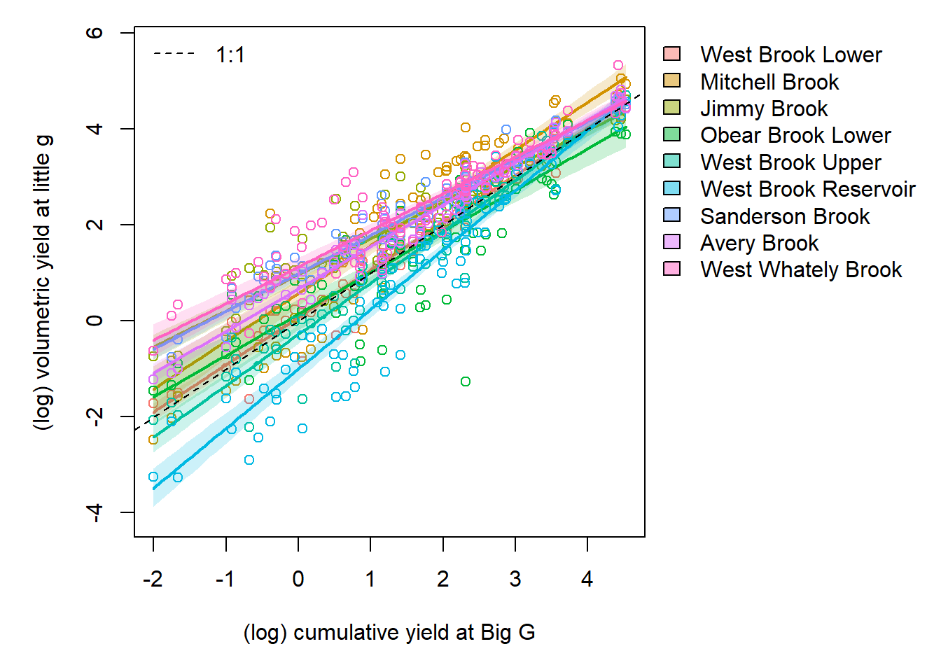 Effect of (log) cumulative yield at Big G on (log) cumulative yield at little g during baseflow and event periods.