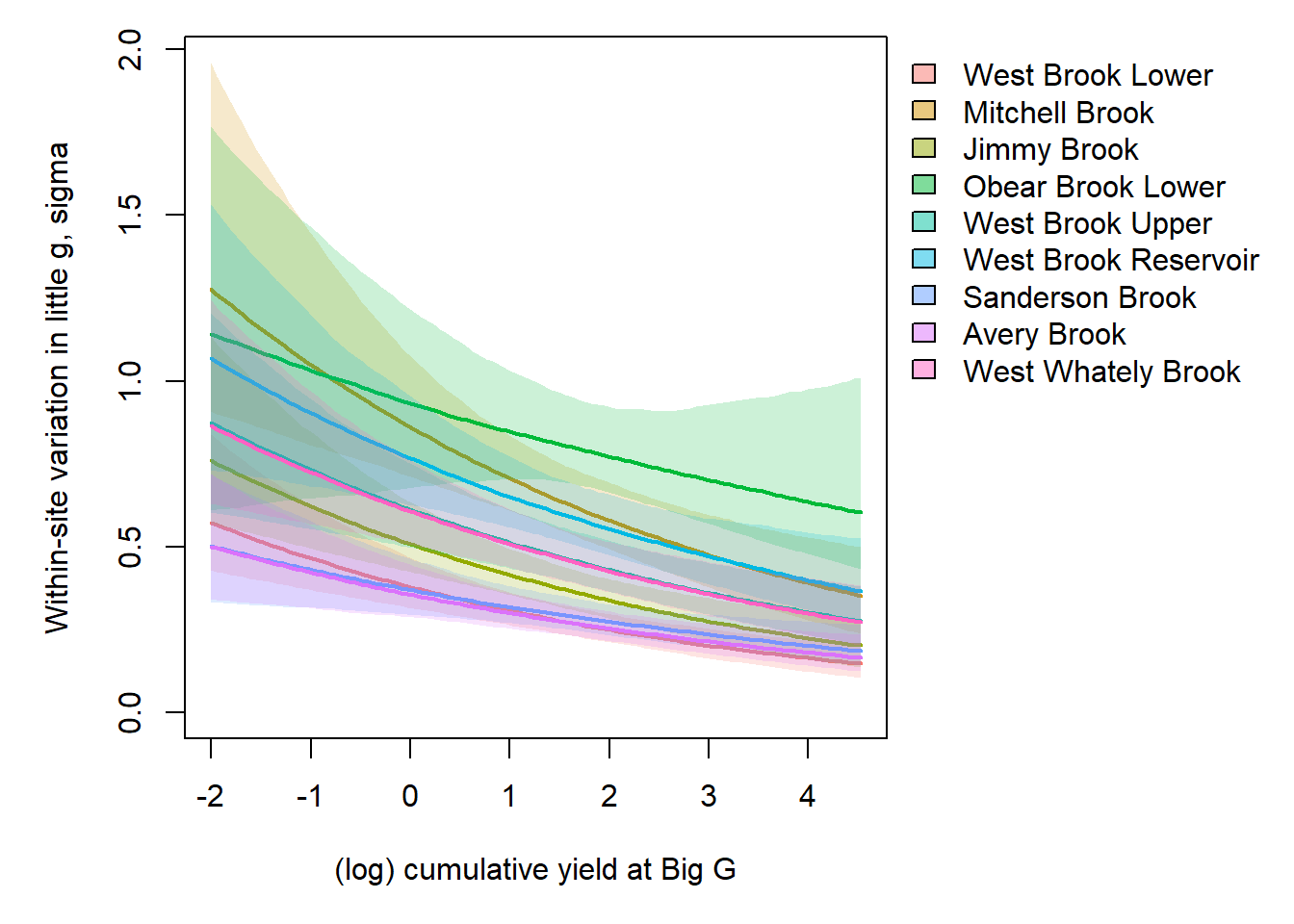 # control panelnvals <-100nsim <-dim(Mcmcdat_0)[1]nsites <-length(unique(dat$site_name_cd))x_seq <-seq(from =min(dat$yield_big_cum_log), to =max(dat$yield_big_cum_log), length.out = nvals)pred_arr <-array(NA, dim =c(nsim, nvals, nsites))pred_arr_summ <-array(NA, dim =c(3, nvals, nsites))for (k in1:nsites) {for (j in1:nsim) { pred_arr[j,,k] <- (exp(Mcmcdat_0[j,paste("sig.alpha[", k, "]", sep ="")] + Mcmcdat_0[j,paste("sig.beta[", k, "]", sep ="")] * x_seq)) }for (i in1:nvals) { pred_arr_summ[1,i,k] <-quantile(pred_arr[,i,k], probs =0.025) pred_arr_summ[2,i,k] <-quantile(pred_arr[,i,k], probs =0.5) pred_arr_summ[3,i,k] <-quantile(pred_arr[,i,k], probs =0.975) }}par(mar =c(5,5,1,11), mfrow =c(1,1))gg_color_hue <-function(n) { hues =seq(15, 375, length = n +1) hcl(h = hues, l =65, c =100)[1:n] }mycols <-gg_color_hue(9)# polygons as 95% CIsplot(seq(from =0, to =range(pred_arr_summ)[2], length.out = nvals) ~ x_seq, type ="n", xlab ="(log) cumulative yield at Big G", ylab ="Within-site variation in little g, sigma")for (k in1:nsites) { polygon(x =c(x_seq, rev(x_seq)), y =c(pred_arr_summ[1,,k], rev(pred_arr_summ[3,,k])), col =alpha(mycols[k], 0.2), border =NA)lines(pred_arr_summ[2,,k] ~ x_seq, col = mycols[k], lwd =2)}par(xpd =TRUE)legend("topright", inset =c(-0.55, 0), legend =levels(dat$site_name), fill =alpha(mycols, 0.5), bty ="n")