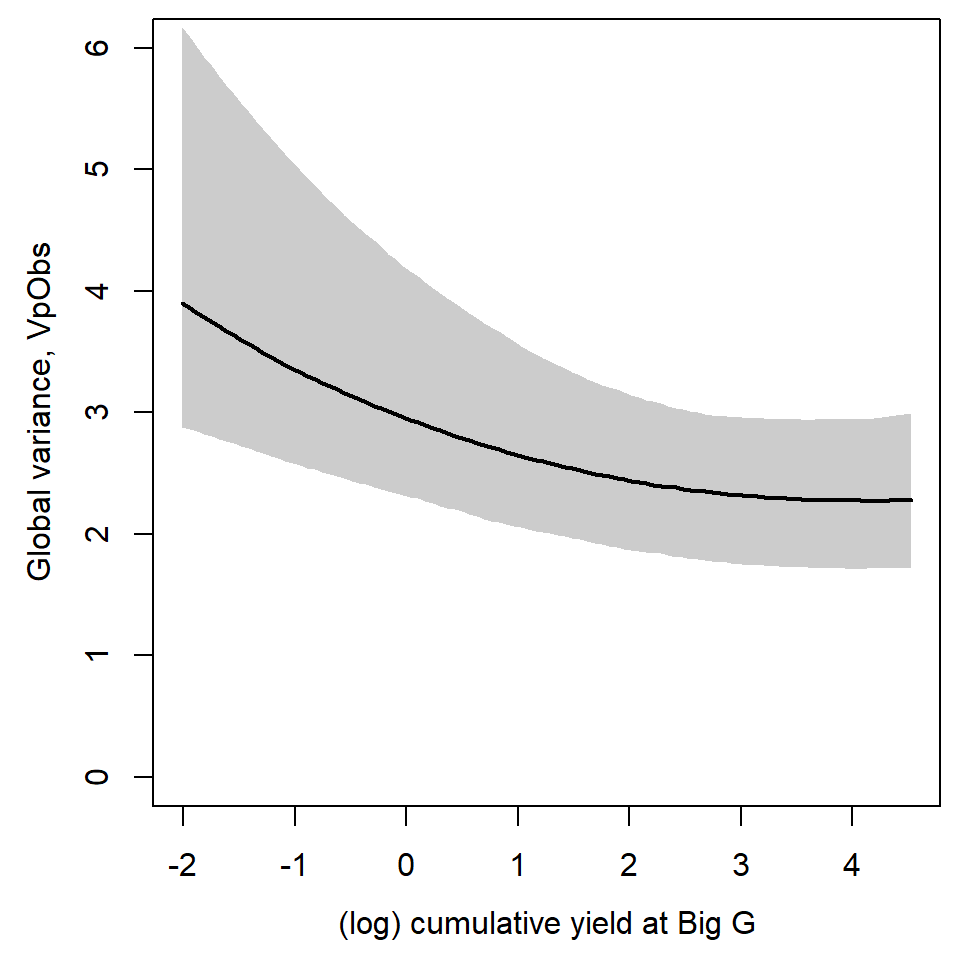 Here, I plot the effect of Big G yield on global (i.e., among-site) variation in little g. How does among-site variation in little g response to big G attenuate with increasing Big G? This is a derived parameter: the square root of the “phenotypic variance” (conditional on x) as defined in Shielzeth and Nakagawa (2022).