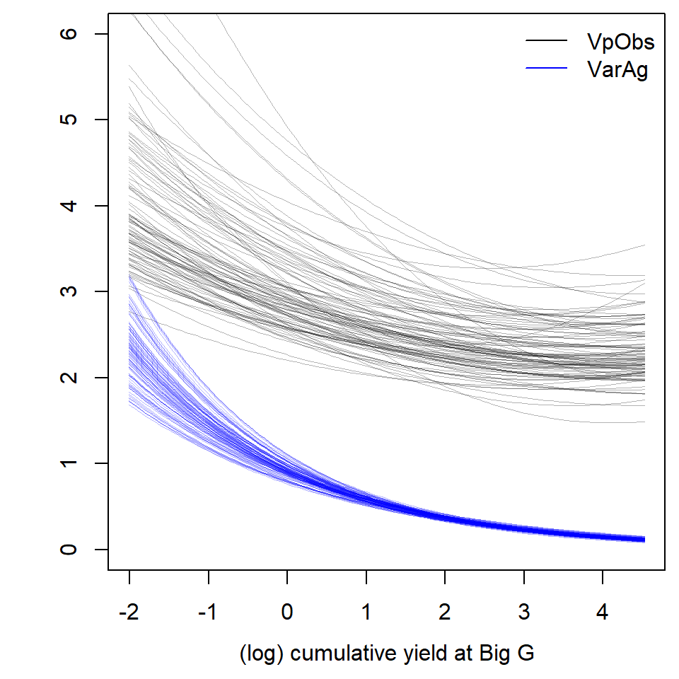 par(mar =c(4,4,0.5,0.5), mgp =c(2.5,1,0))nsim <-100plot(seq(from =0, to =6, length.out = ndiff) ~ QGvec, type ="n", xlab ="(log) cumulative yield at Big G", ylab ="")for (i in1:nsim) { lines((Mcmcdat_0[i, str_subset(colnames(Mcmcdat_0), pattern ="VpObs")]) ~ QGvec, col =alpha("black", 0.3), lwd =0.5) }for (i in1:nsim) { lines((Mcmcdat_0[i, str_subset(colnames(Mcmcdat_0), pattern ="VarAg")]) ~ QGvec, col =alpha("blue", 0.3), lwd =0.5) }legend("topright", legend =c("VpObs", "VarAg"), lty =1, col =c("black", "blue"), bty ="n")
