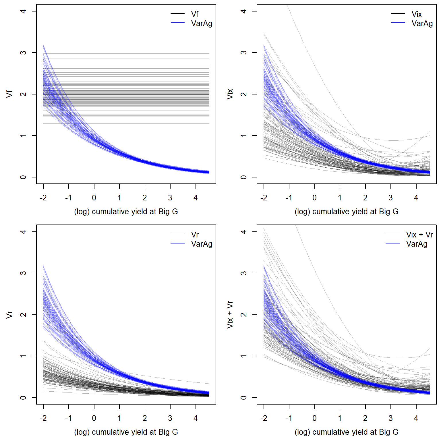 par(mar =c(4,4,0.5,0.5), mgp =c(2.5,1,0), mfrow =c(2,2))nsim <-100# Vfplot(seq(from =0, to =4, length.out = ndiff) ~ QGvec, type ="n", xlab ="(log) cumulative yield at Big G", ylab ="Vf")for (i in1:nsim) { lines((Mcmcdat_0[i, str_subset(colnames(Mcmcdat_0), pattern ="Vf")]) ~ QGvec, col =alpha("black", 0.3), lwd =0.5) }for (i in1:nsim) { lines((Mcmcdat_0[i, str_subset(colnames(Mcmcdat_0), pattern ="VarAg")]) ~ QGvec, col =alpha("blue", 0.3), lwd =0.5) }legend("topright", legend =c("Vf", "VarAg"), lty =1, col =c("black", "blue"), bty ="n")# Vixplot(seq(from =0, to =4, length.out = ndiff) ~ QGvec, type ="n", xlab ="(log) cumulative yield at Big G", ylab ="Vix")for (i in1:nsim) { lines((Mcmcdat_0[i, str_subset(colnames(Mcmcdat_0), pattern ="Vix")]) ~ QGvec, col =alpha("black", 0.3), lwd =0.5) }for (i in1:nsim) { lines((Mcmcdat_0[i, str_subset(colnames(Mcmcdat_0), pattern ="VarAg")]) ~ QGvec, col =alpha("blue", 0.3), lwd =0.5) }legend("topright", legend =c("Vix", "VarAg"), lty =1, col =c("black", "blue"), bty ="n")# Vrplot(seq(from =0, to =4, length.out = ndiff) ~ QGvec, type ="n", xlab ="(log) cumulative yield at Big G", ylab ="Vr")for (i in1:nsim) { lines((Mcmcdat_0[i, str_subset(colnames(Mcmcdat_0), pattern ="Vr")]) ~ QGvec, col =alpha("black", 0.3), lwd =0.5) }for (i in1:nsim) { lines((Mcmcdat_0[i, str_subset(colnames(Mcmcdat_0), pattern ="VarAg")]) ~ QGvec, col =alpha("blue", 0.3), lwd =0.5) }legend("topright", legend =c("Vr", "VarAg"), lty =1, col =c("black", "blue"), bty ="n")# Vix + Vrplot(seq(from =0, to =4, length.out = ndiff) ~ QGvec, type ="n", xlab ="(log) cumulative yield at Big G", ylab ="Vix + Vr")for (i in1:nsim) { lines((Mcmcdat_0[i, str_subset(colnames(Mcmcdat_0), pattern ="Vix")]) + (Mcmcdat_0[i, str_subset(colnames(Mcmcdat_0), pattern ="Vr")]) ~ QGvec, col =alpha("black", 0.3), lwd =0.5) }for (i in1:nsim) { lines((Mcmcdat_0[i, str_subset(colnames(Mcmcdat_0), pattern ="VarAg")]) ~ QGvec, col =alpha("blue", 0.3), lwd =0.5) }legend("topright", legend =c("Vix + Vr", "VarAg"), lty =1, col =c("black", "blue"), bty ="n")