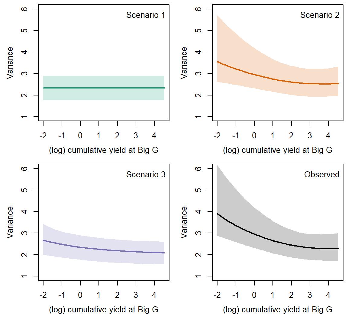 # plotmycols <-c(brewer.pal(3, "Dark2"), "black")par(mar =c(4,4,0.5,0.5), mgp =c(2.5,1,0), mfrow =c(2,2))# VpScen1plot(seq(from =1, to =6, length.out = ndiff) ~ QGvec, type ="n", xlab ="(log) cumulative yield at Big G", ylab ="Variance")polygon(x =c(QGvec, rev(QGvec)), y =c(pred_arr_VpScen1_summ[,1], rev(pred_arr_VpScen1_summ[,3])), col =alpha(mycols[1], 0.2), border =NA)lines(pred_arr_VpScen1_summ[,2] ~ QGvec, col = mycols[1], lwd =2)legend("topright", legend ="Scenario 1", bty ="n")# VpScen2plot(seq(from =1, to =6, length.out = ndiff) ~ QGvec, type ="n", xlab ="(log) cumulative yield at Big G", ylab ="Variance")polygon(x =c(QGvec, rev(QGvec)), y =c(pred_arr_VpScen2_summ[,1], rev(pred_arr_VpScen2_summ[,3])), col =alpha(mycols[2], 0.2), border =NA)lines(pred_arr_VpScen2_summ[,2] ~ QGvec, col = mycols[2], lwd =2)legend("topright", legend ="Scenario 2", bty ="n")# VpScen3plot(seq(from =1, to =6, length.out = ndiff) ~ QGvec, type ="n", xlab ="(log) cumulative yield at Big G", ylab ="Variance")polygon(x =c(QGvec, rev(QGvec)), y =c(pred_arr_VpScen3_summ[,1], rev(pred_arr_VpScen3_summ[,3])), col =alpha(mycols[3], 0.2), border =NA)lines(pred_arr_VpScen3_summ[,2] ~ QGvec, col = mycols[3], lwd =2)legend("topright", legend ="Scenario 3", bty ="n")# VpObsplot(seq(from =1, to =6, length.out = ndiff) ~ QGvec, type ="n", xlab ="(log) cumulative yield at Big G", ylab ="Variance")polygon(x =c(QGvec, rev(QGvec)), y =c(pred_arr_VpObs_summ[,1], rev(pred_arr_VpObs_summ[,3])), col =alpha(mycols[4], 0.2), border =NA)lines(pred_arr_VpObs_summ[,2] ~ QGvec, col = mycols[4], lwd =2)legend("topright", legend ="Observed", bty ="n")