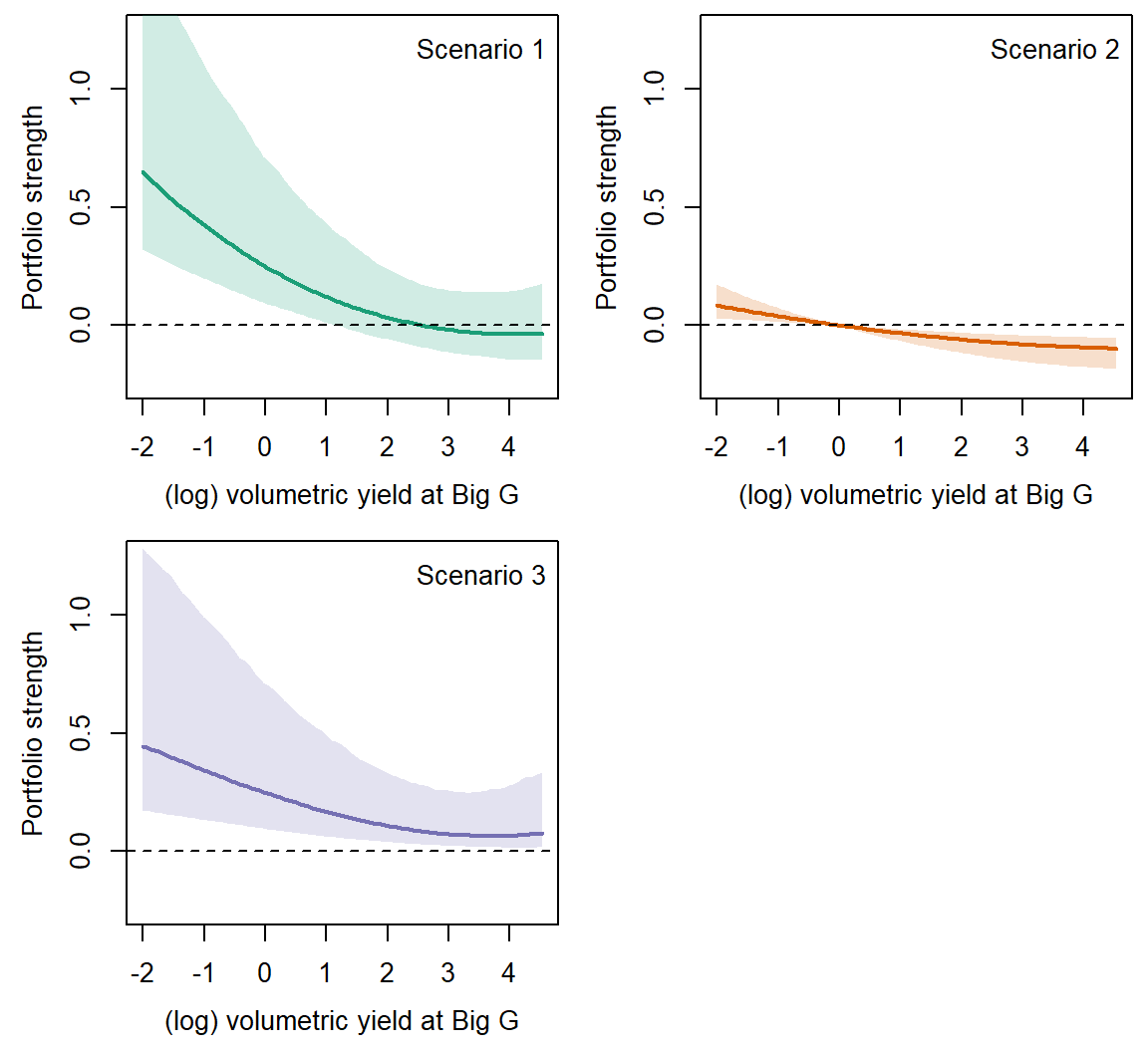 # plotmycols <-c(brewer.pal(3, "Dark2"), "black")par(mar =c(4,4,0.5,0.5), mgp =c(2.5,1,0), mfrow =c(2,2))ylim1 <--0.25ylim2 <-1.25# VpScen1plot(seq(from = ylim1, to = ylim2, length.out = ndiff) ~ QGvec, type ="n", xlab ="(log) volumetric yield at Big G", ylab ="Portfolio strength")polygon(x =c(QGvec, rev(QGvec)), y =c(pred_arr_Port1_summ[,1], rev(pred_arr_Port1_summ[,3])), col =alpha(mycols[1], 0.2), border =NA)lines(pred_arr_Port1_summ[,2] ~ QGvec, col = mycols[1], lwd =2)legend("topright", legend ="Scenario 1", bty ="n")abline(h =0, lty =2)# VpScen2plot(seq(from = ylim1, to = ylim2, length.out = ndiff) ~ QGvec, type ="n", xlab ="(log) volumetric yield at Big G", ylab ="Portfolio strength")polygon(x =c(QGvec, rev(QGvec)), y =c(pred_arr_Port2_summ[,1], rev(pred_arr_Port2_summ[,3])), col =alpha(mycols[2], 0.2), border =NA)lines(pred_arr_Port2_summ[,2] ~ QGvec, col = mycols[2], lwd =2)legend("topright", legend ="Scenario 2", bty ="n")abline(h =0, lty =2)# VpScen3plot(seq(from = ylim1, to = ylim2, length.out = ndiff) ~ QGvec, type ="n", xlab ="(log) volumetric yield at Big G", ylab ="Portfolio strength")polygon(x =c(QGvec, rev(QGvec)), y =c(pred_arr_Port3_summ[,1], rev(pred_arr_Port3_summ[,3])), col =alpha(mycols[3], 0.2), border =NA)lines(pred_arr_Port3_summ[,2] ~ QGvec, col = mycols[3], lwd =2)legend("topright", legend ="Scenario 3", bty ="n")abline(h =0, lty =2)