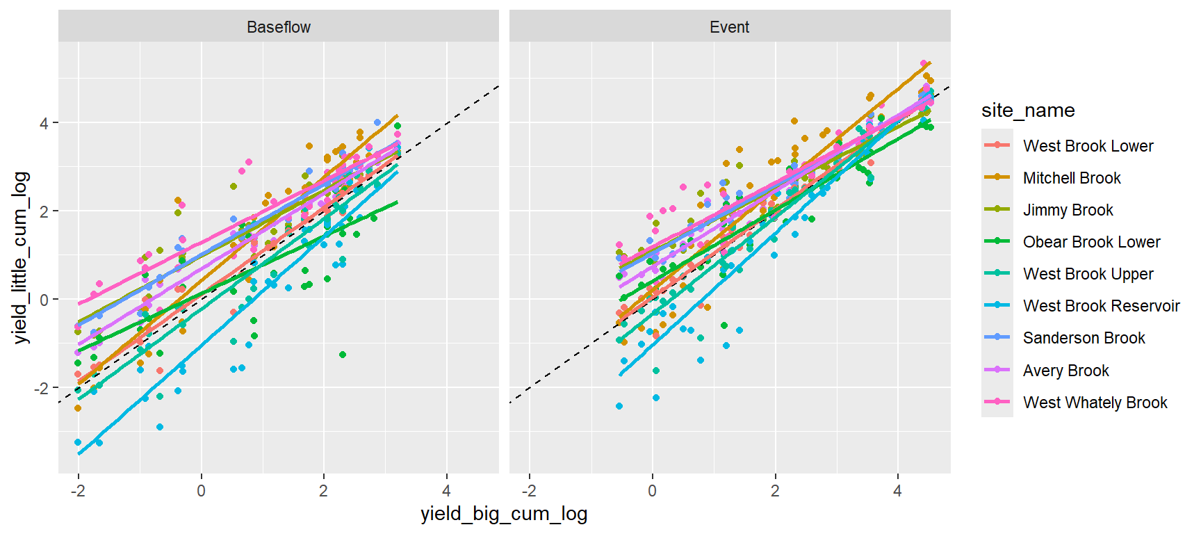 dat %>%mutate(isevent = dplyr::recode(isevent, "1"="Event", "2"="Baseflow")) %>%ggplot(aes(x = yield_big_cum_log, y = yield_little_cum_log, group = site_name, color = site_name)) +geom_point() +geom_abline(intercept =0, slope =1, linetype ="dashed") +geom_smooth(method ="lm", se = F) +facet_wrap(~isevent)