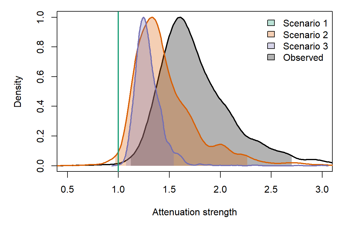 mycols <-c(brewer.pal(3, "Dark2"), "black")par(mar =c(5,5,1,1), mfrow =c(1,1))plot(seq(from =0, to =1, length.out =100) ~seq(from =0.5, to =3, length.out =100), type ="n", xlab ="Attenuation strength", ylab ="Density")# observedobs_den <-density(Mcmcdat_0[,"attenObs"])obs_den$y2 <- obs_den$y /max(obs_den$y)obs_l <-min(which(obs_den$x >=hdi(obs_den, credMass =0.95)[1]))obs_h <-max(which(obs_den$x <hdi(obs_den, credMass =0.95)[2]))polygon(x =c(obs_den$x[c(obs_l,obs_l:obs_h,obs_h)]), y =c(0,obs_den$y2[obs_l:obs_h],0), col =alpha(mycols[4], 0.3), lty =0)lines(obs_den$y2 ~ obs_den$x, col = mycols[4], lwd =2)# scenario 2exp_den <-density(Mcmcdat_0[,"atten2"])exp_den$y2 <- exp_den$y /max(exp_den$y)exp_l <-min(which(exp_den$x >=hdi(exp_den, credMass =0.95)[1]))exp_h <-max(which(exp_den$x <hdi(exp_den, credMass =0.95)[2]))polygon(x =c(exp_den$x[c(exp_l,exp_l:exp_h,exp_h)]), y =c(0,exp_den$y2[exp_l:exp_h],0), col =alpha(mycols[2], 0.3), lty =0)lines(exp_den$y2 ~ exp_den$x, col = mycols[2], lwd =2)# scenario 3exp_den <-density(Mcmcdat_0[,"atten3"])exp_den$y2 <- exp_den$y /max(exp_den$y)exp_l <-min(which(exp_den$x >=hdi(exp_den, credMass =0.95)[1]))exp_h <-max(which(exp_den$x <hdi(exp_den, credMass =0.95)[2]))polygon(x =c(exp_den$x[c(exp_l,exp_l:exp_h,exp_h)]), y =c(0,exp_den$y2[exp_l:exp_h],0), col =alpha(mycols[3], 0.3), lty =0)lines(exp_den$y2 ~ exp_den$x, col = mycols[3], lwd =2)legend("topright", legend =c("Scenario 1", "Scenario 2", "Scenario 3", "Observed"), fill =alpha(mycols, 0.3), bty ="n")abline(v =1, lty =1, lwd =2, col = mycols[1])