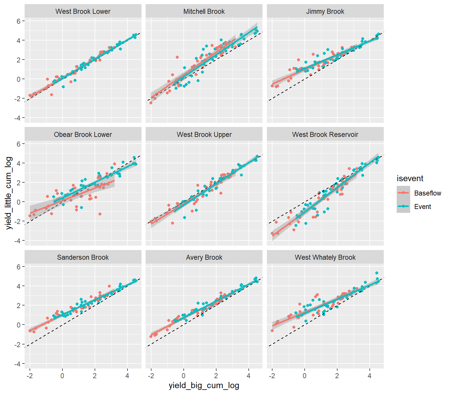 dat %>%mutate(isevent = dplyr::recode(isevent, "1"="Event", "2"="Baseflow")) %>%ggplot(aes(x = yield_big_cum_log, y = yield_little_cum_log, group = isevent, color = isevent)) +geom_point() +geom_abline(intercept =0, slope =1, linetype ="dashed") +geom_smooth(method ="lm") +facet_wrap(~site_name)
