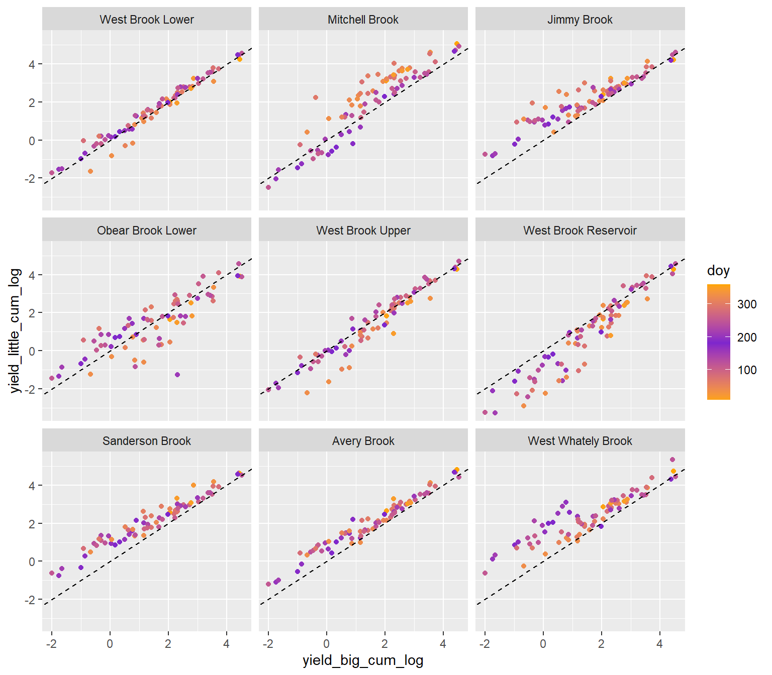 dat %>%mutate(doy =yday(mindate)) %>%ggplot(aes(x = yield_big_cum_log, y = yield_little_cum_log, color = doy)) +geom_point() +geom_abline(intercept =0, slope =1, linetype ="dashed") +scale_color_gradient2(midpoint =182, low ="orange", mid ="purple3", high ="orange") +facet_wrap(~site_name)
