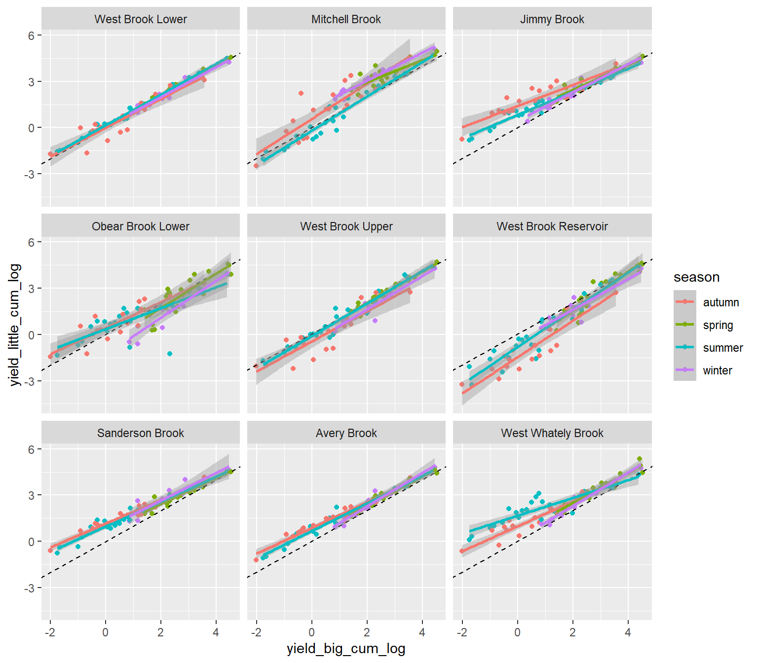 dat %>%mutate(season =ifelse(month(mindate) %in%c(12,1,2), "winter",ifelse(month(mindate) %in%c(3,4,5), "spring",ifelse(month(mindate) %in%c(6,7,8), "summer", "autumn")))) %>%ggplot(aes(x = yield_big_cum_log, y = yield_little_cum_log, group = season, color = season)) +geom_point() +geom_abline(intercept =0, slope =1, linetype ="dashed") +geom_smooth(method ="lm") +facet_wrap(~site_name)