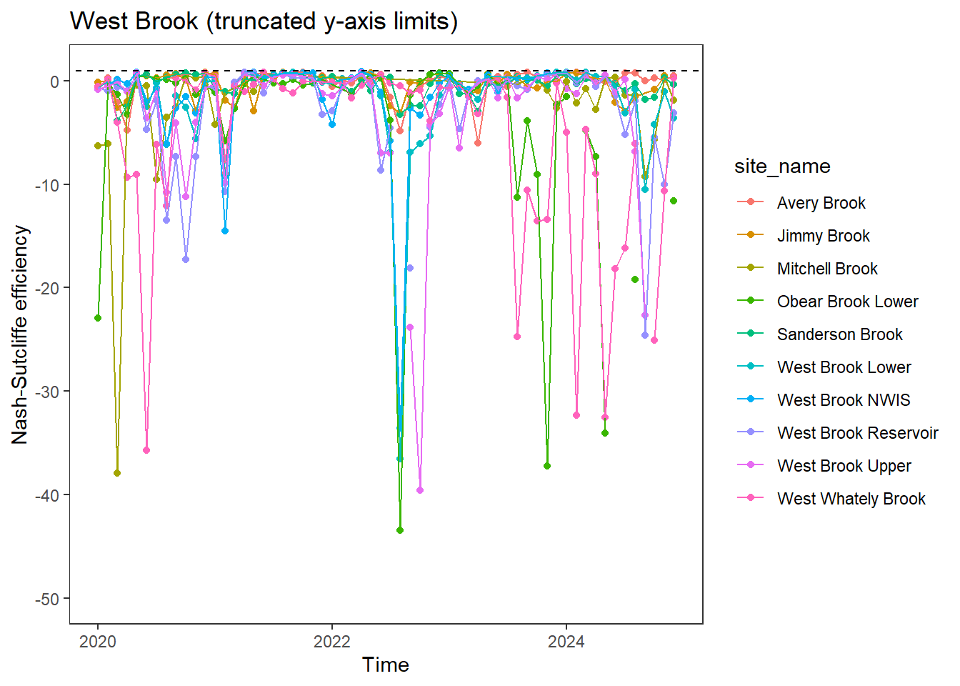 xlab("Time") + ylab("Nash-Sutcliffe efficiency") + ggtitle("West Brook (truncated y-axis limits)") +