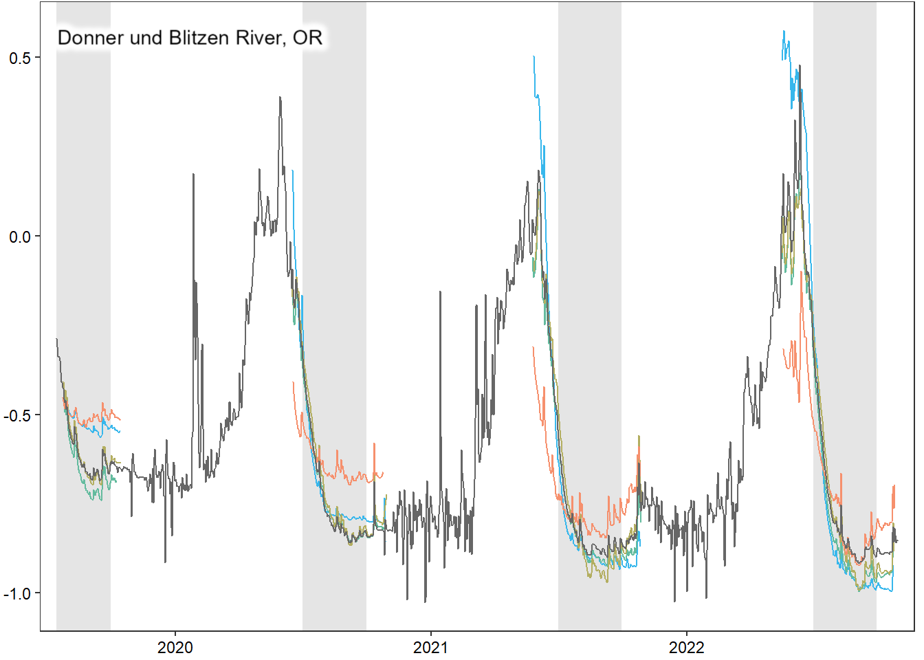 View daily time series data by sub-basin. Note that we are using the “Super G” NWIS data for the reference gage (black line). Per Robert comment, entirely nested design is cute, but doesn’t reflect how the data is actually used.