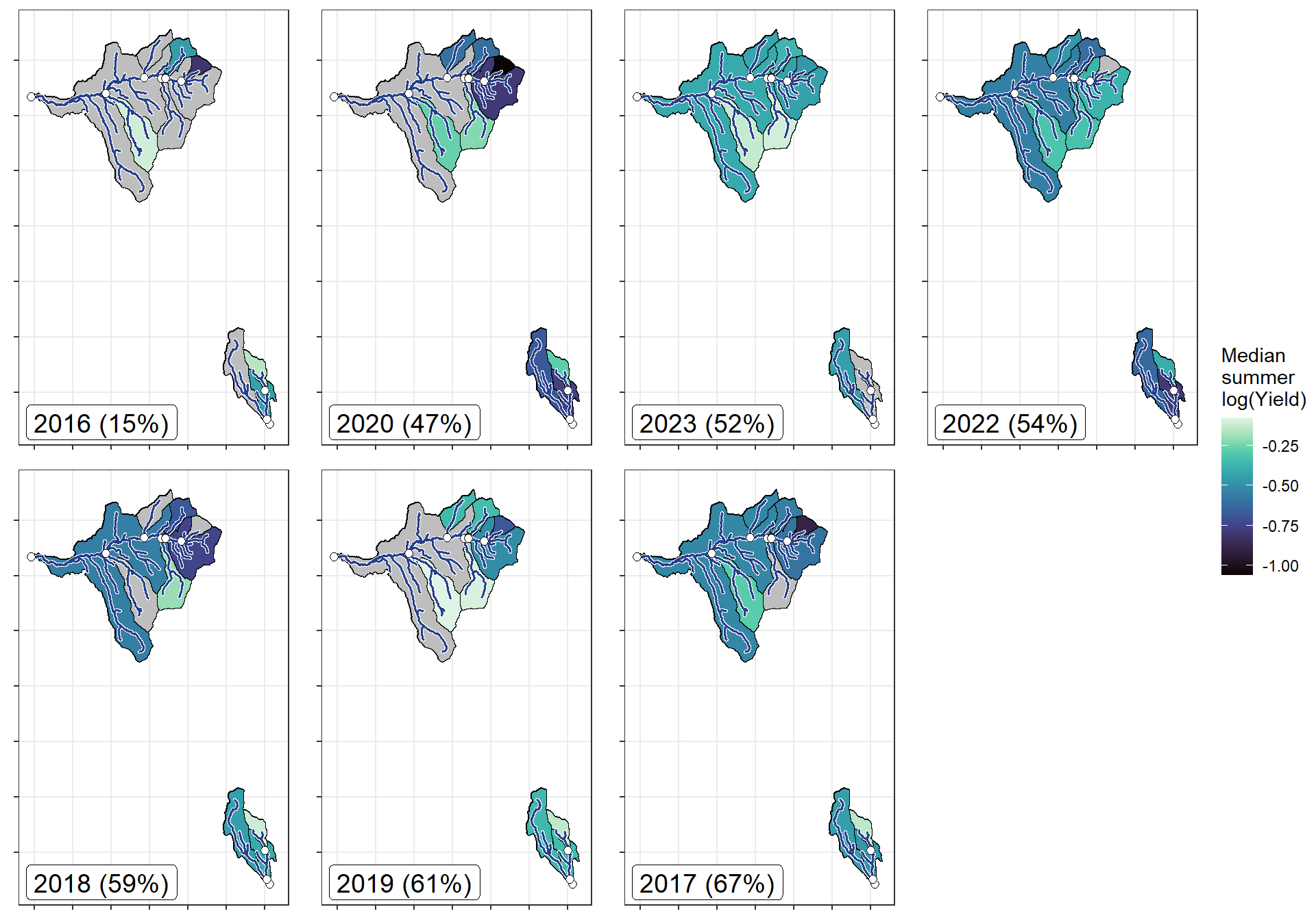 xlab("Total annual yield (percentile)") + ylab("Total summer yield (percentile)") +