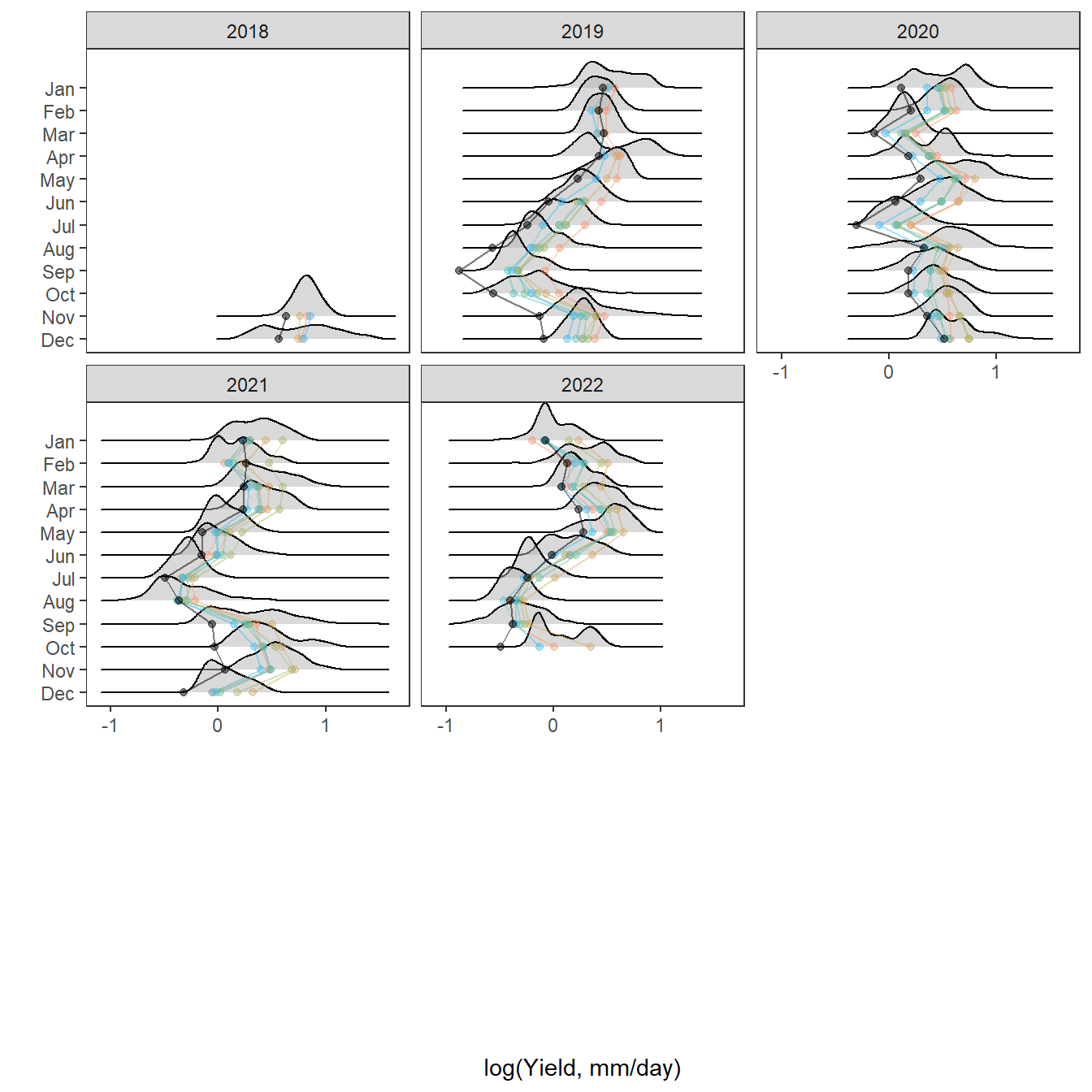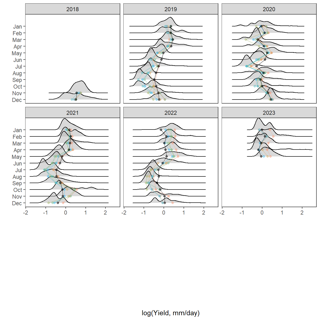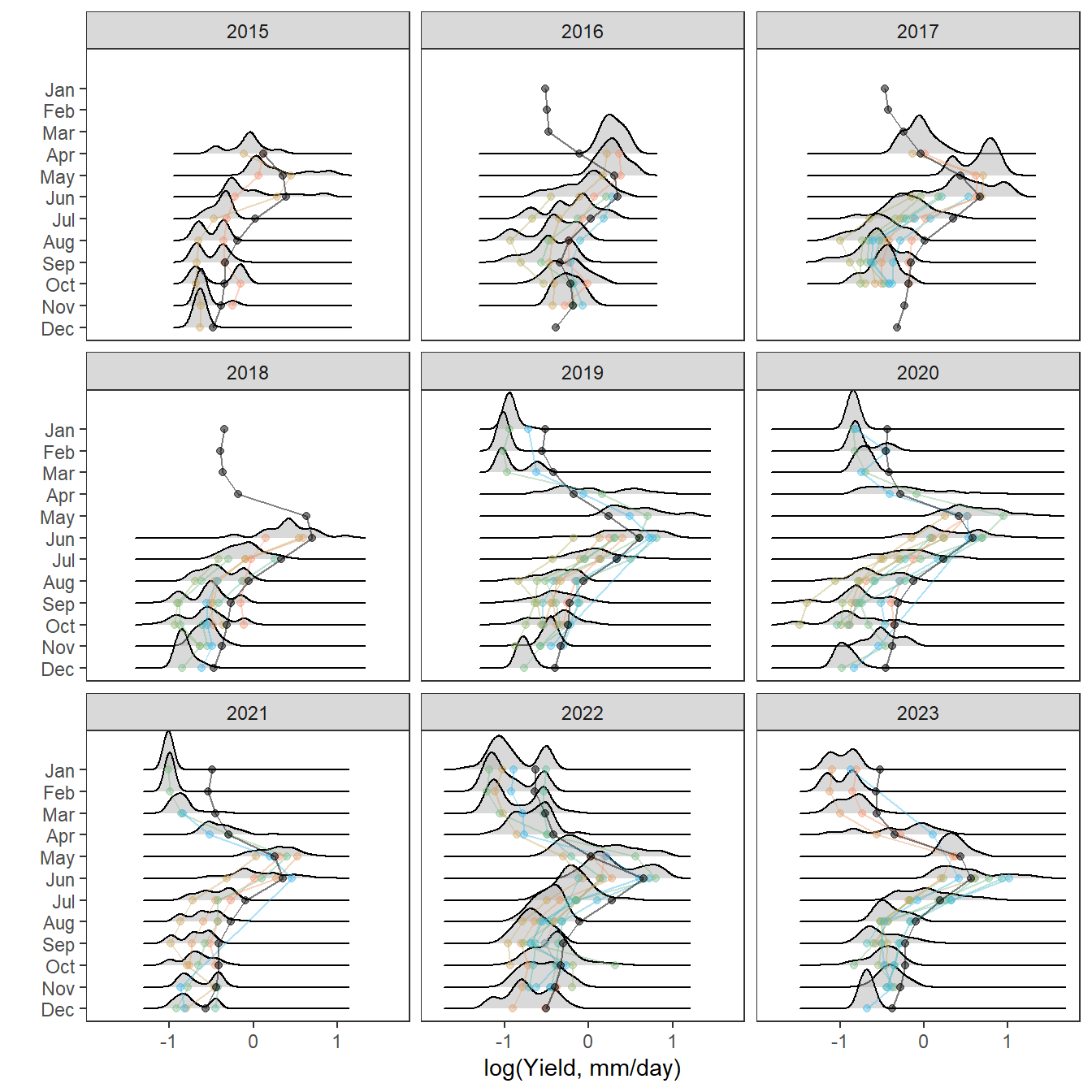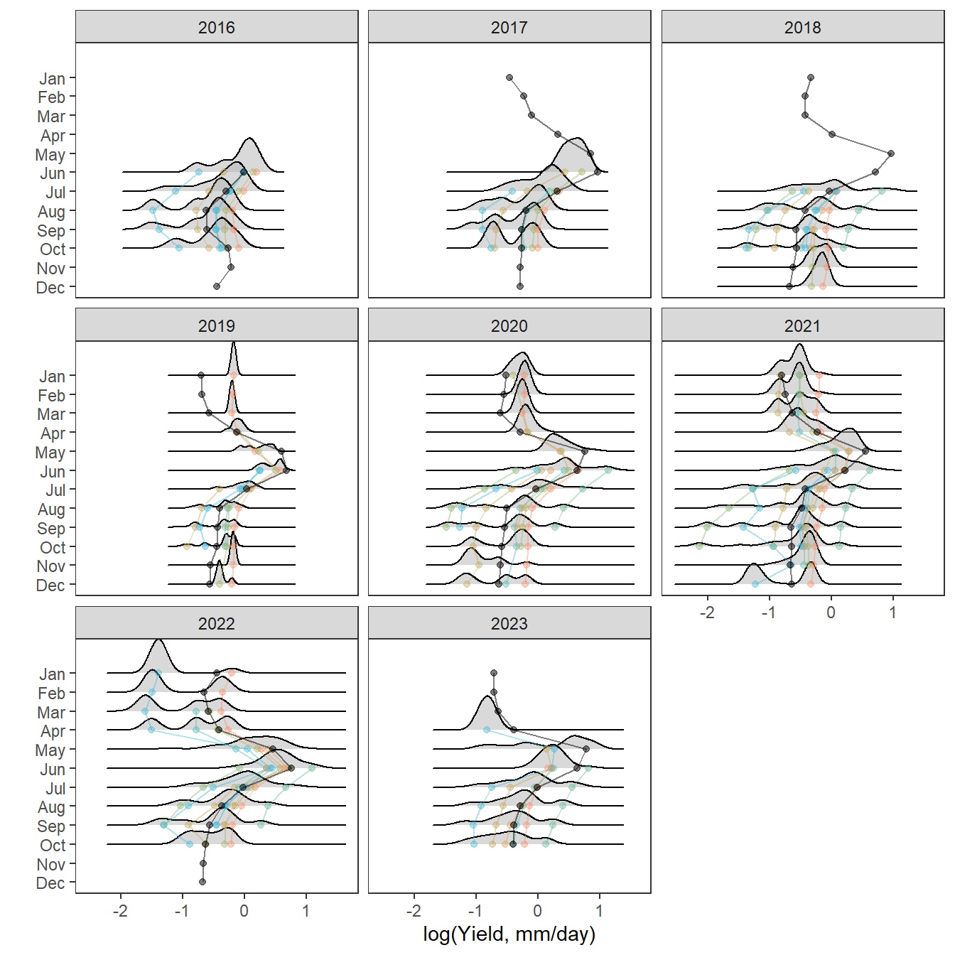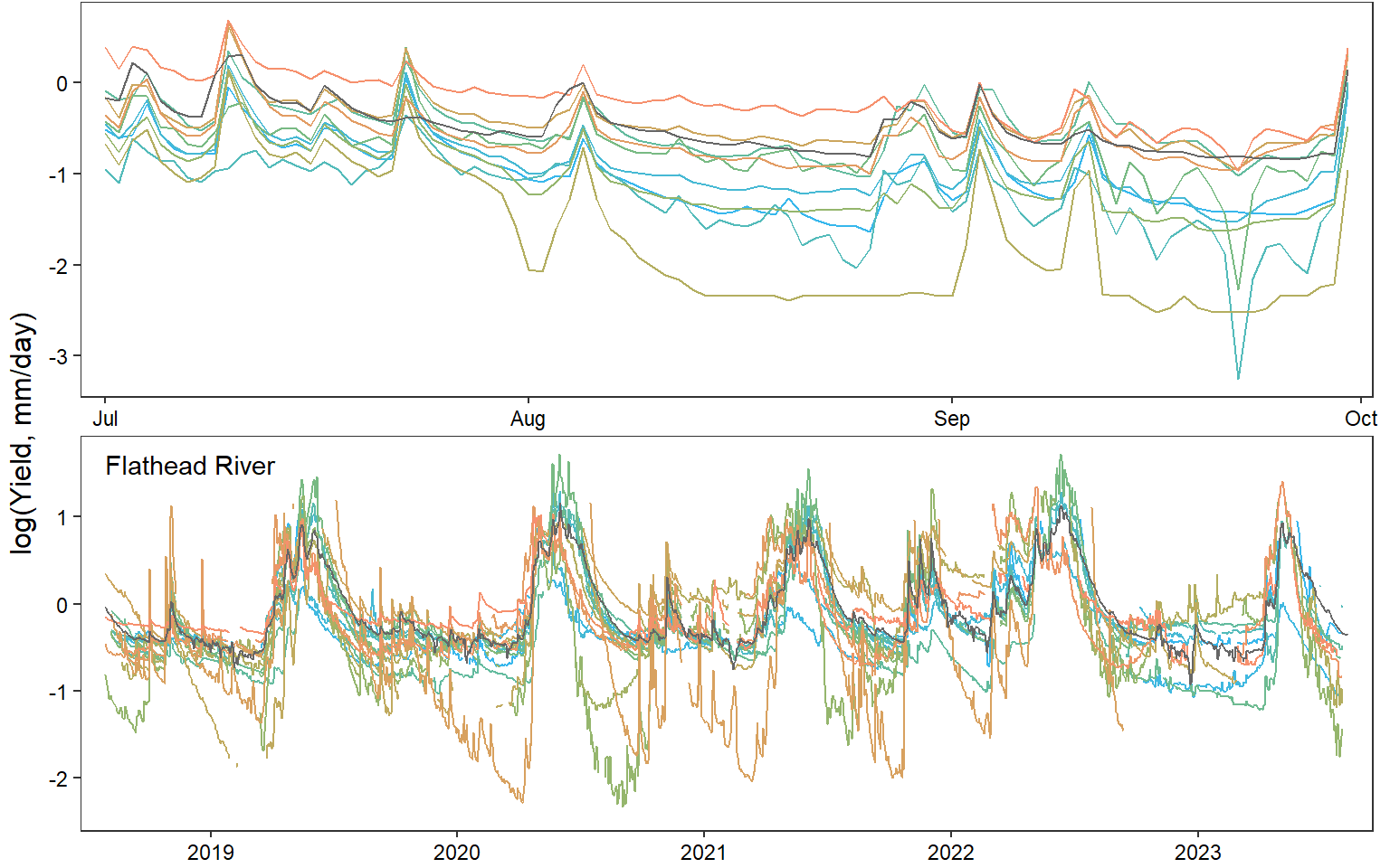 mtext("log(Daily yield, mm)", outer = TRUE, side = 2, line = 0.5)