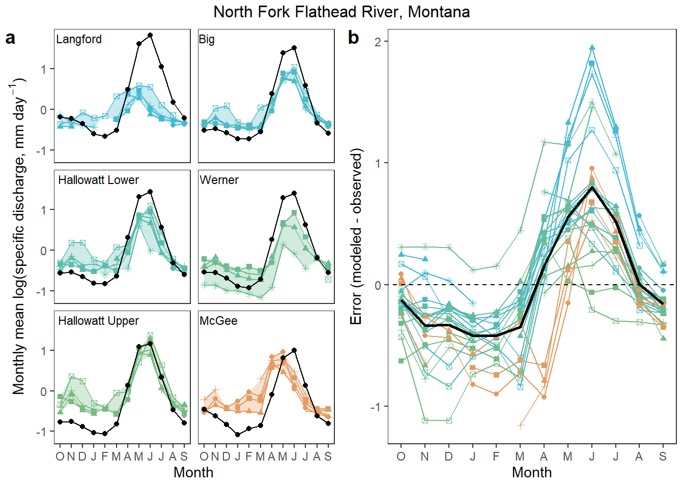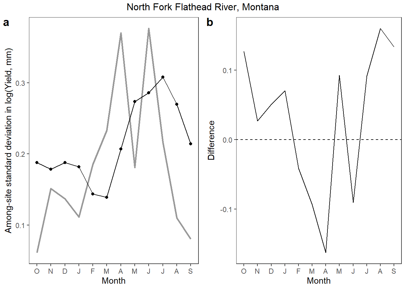 annotate_figure(ggarrange(p1, p2, ncol = 2, labels = "auto"), top = text_grob("North Fork Flathead River, Montana"))
