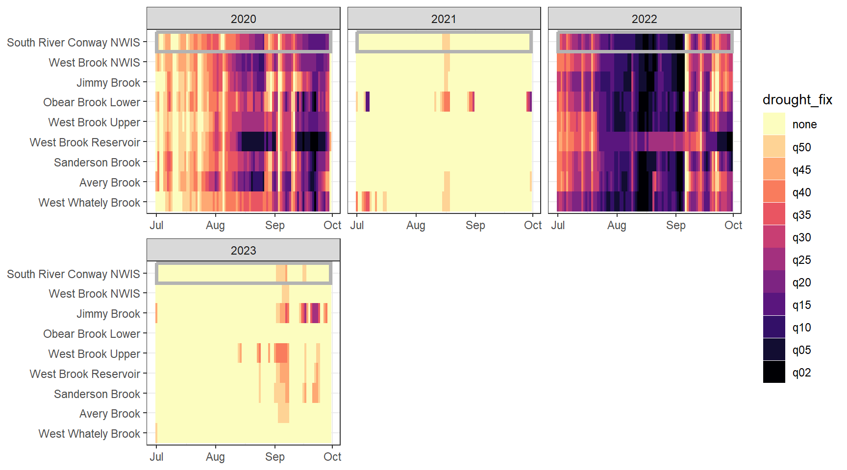 # jpeg("C:/Users/jbaldock/OneDrive - DOI/Documents/USGS/EcoDrought/EcoDrought Working/Presentation figs/DroughtDuration_sitelevel_WestBrook_2020-2021_updatebasinnoci_wide.jpg", width = 8.75, height = 5.5, units = "in", res = 1000)