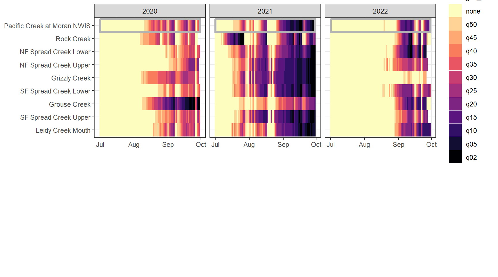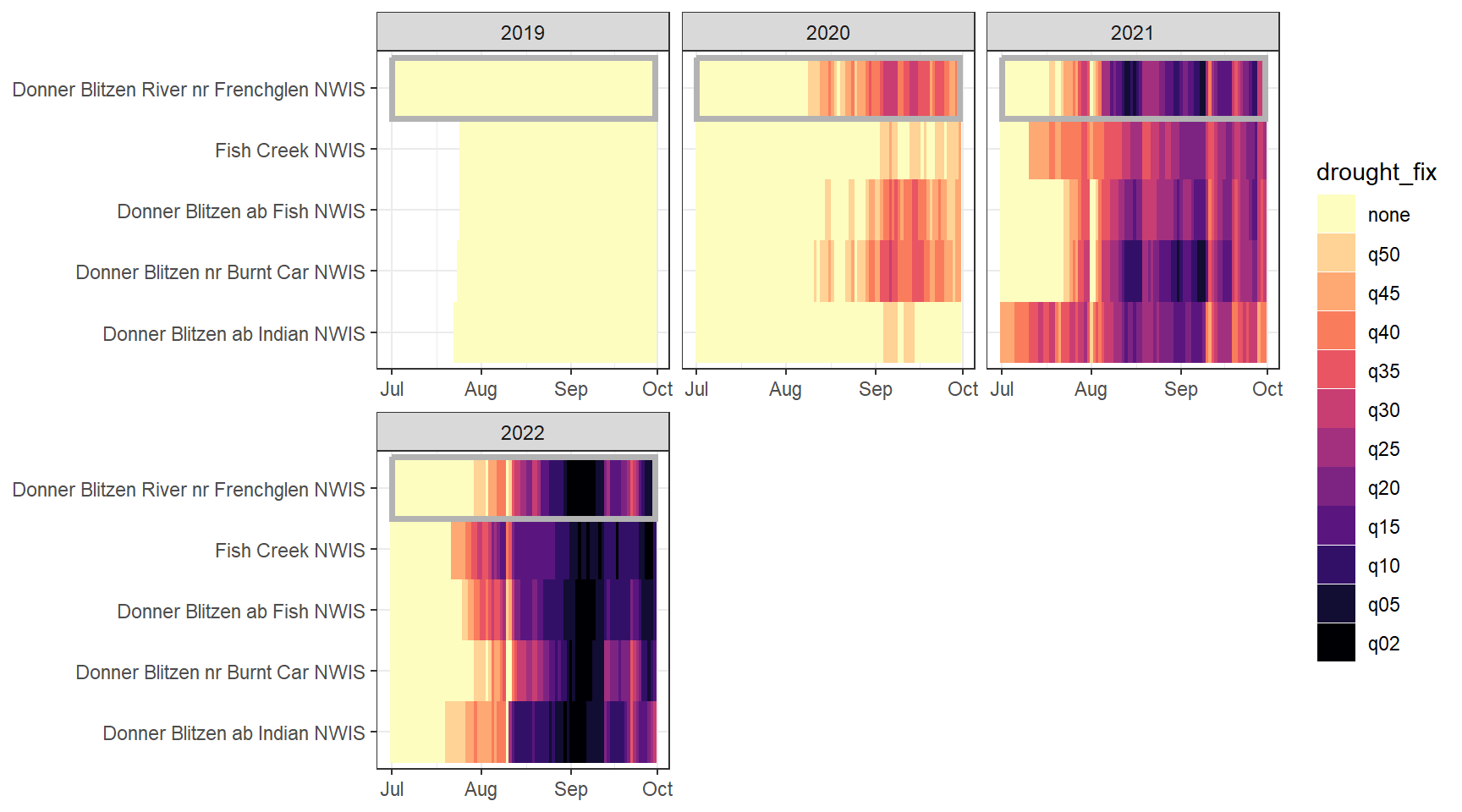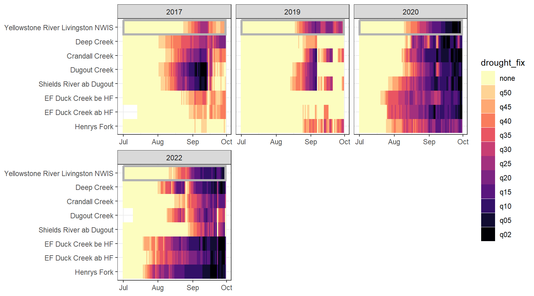 mydroughtlevels <- c("none", "q50", "q45", "q40", "q35", "q30", "q25", "q20", "q15", "q10", "q05", "q02")Drought/low flow delineation is somewhat complicated by the fact that some streams simply have greater yield than others. For example, using low flow thresholds derived from the reference gage and applied to headwater gages will never detect low flow conditions at groundwater-dominated sites, but this doesn’t mean that flow at that site isn’t lower than normal (for that site). This is most obvious in the Snake River basin, where NF Spread Creek Upper never experiences drought (because this is presumably a gaining reach) and Rock and Grouse Creeks are in a perpetual state of drought (presumable these are losing reaches). This is a classic “At which level of organization do I standardize my data?” question: are general differences in flow volume among sites signal or noise? But perhaps more importantly, this is a question of “what is drought?” Is drought relative to some larger regional metric (e.g., big G)? Or is it a local phenomenon, where the specifics of individual streams and reaches matter.