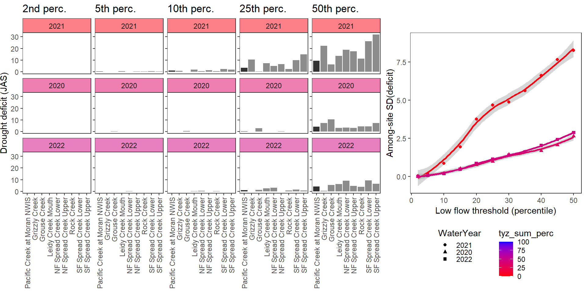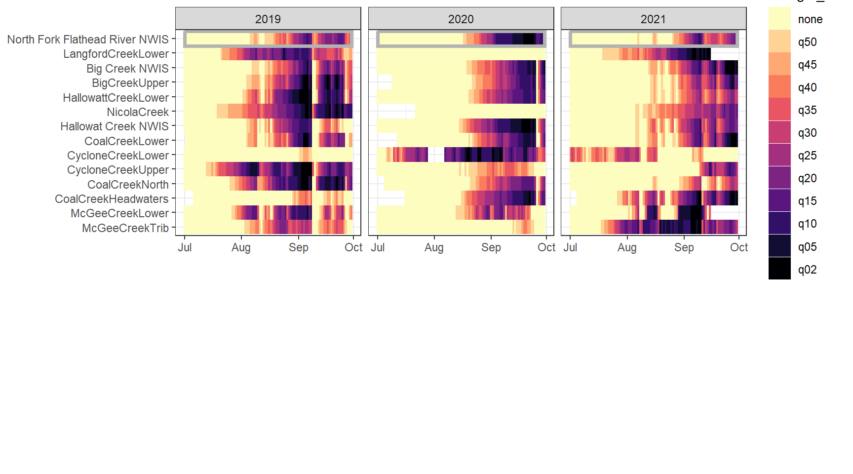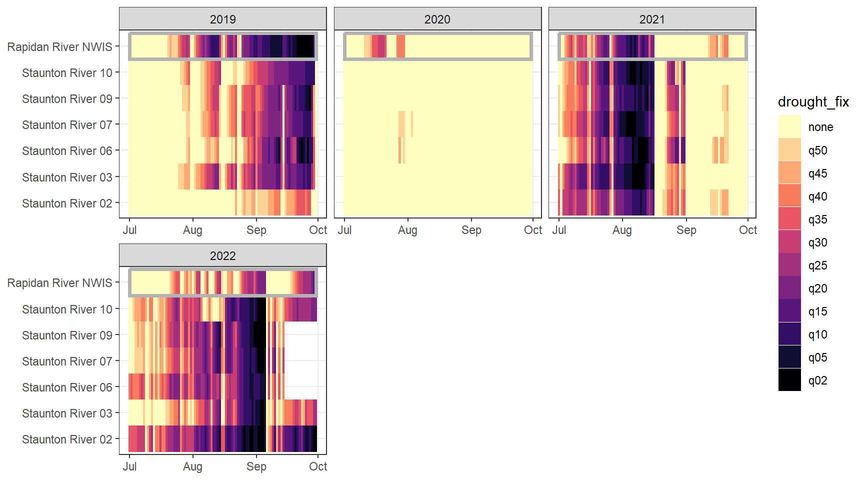mydroughtlevels <- c("none", "q50", "q45", "q40", "q35", "q30", "q25", "q20", "q15", "q10", "q05", "q02")Drought/low flow delineation is somewhat complicated by the fact that some streams simply have greater yield than others. For example, using low flow thresholds derived from the reference gage and applied to headwater gages will never detect low flow conditions at groundwater-dominated sites, but this doesn’t mean that flow at that site isn’t lower than normal (for that site). This is most obvious in the Snake River basin, where NF Spread Creek Upper never experiences drought (because this is presumably a gaining reach) and Rock and Grouse Creeks are in a perpetual state of drought (presumable these are losing reaches). This is a classic “At which level of organization do I standardize my data?” question: are general differences in flow volume among sites signal or noise? But perhaps more importantly, this is a question of “what is drought?” Is drought relative to some larger regional metric (e.g., big G)? Or is it a local phenomenon, where the specifics of individual streams and reaches matter.