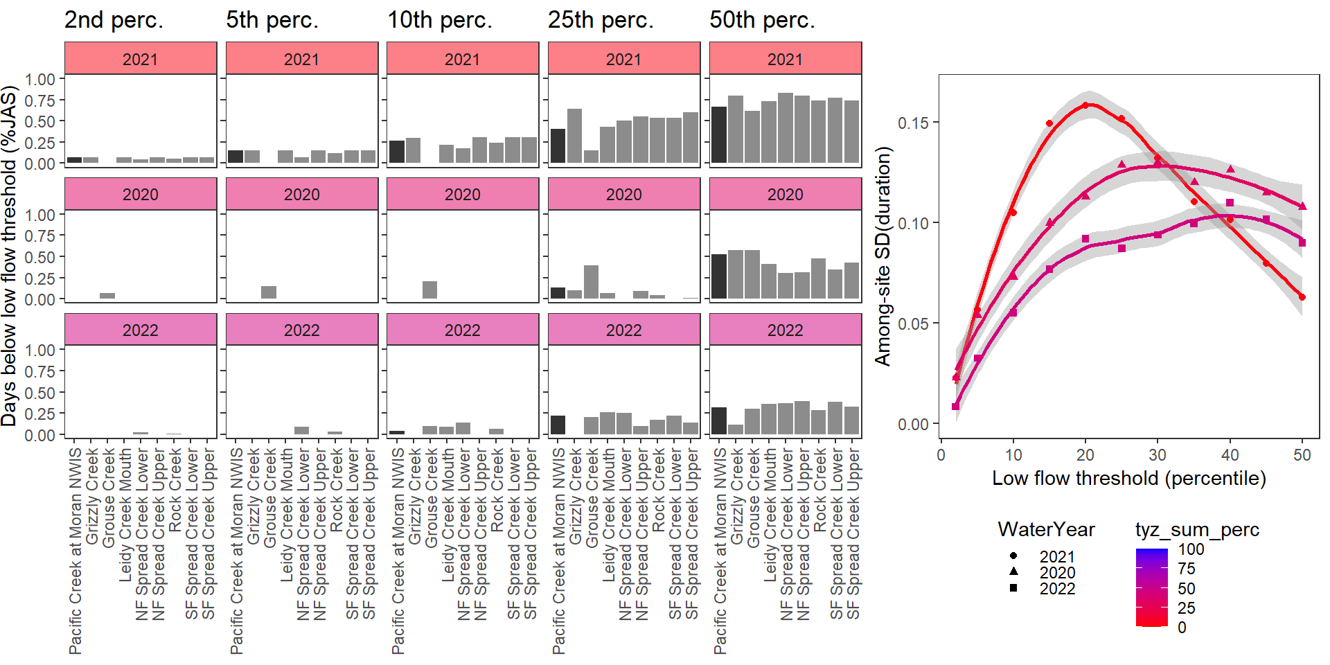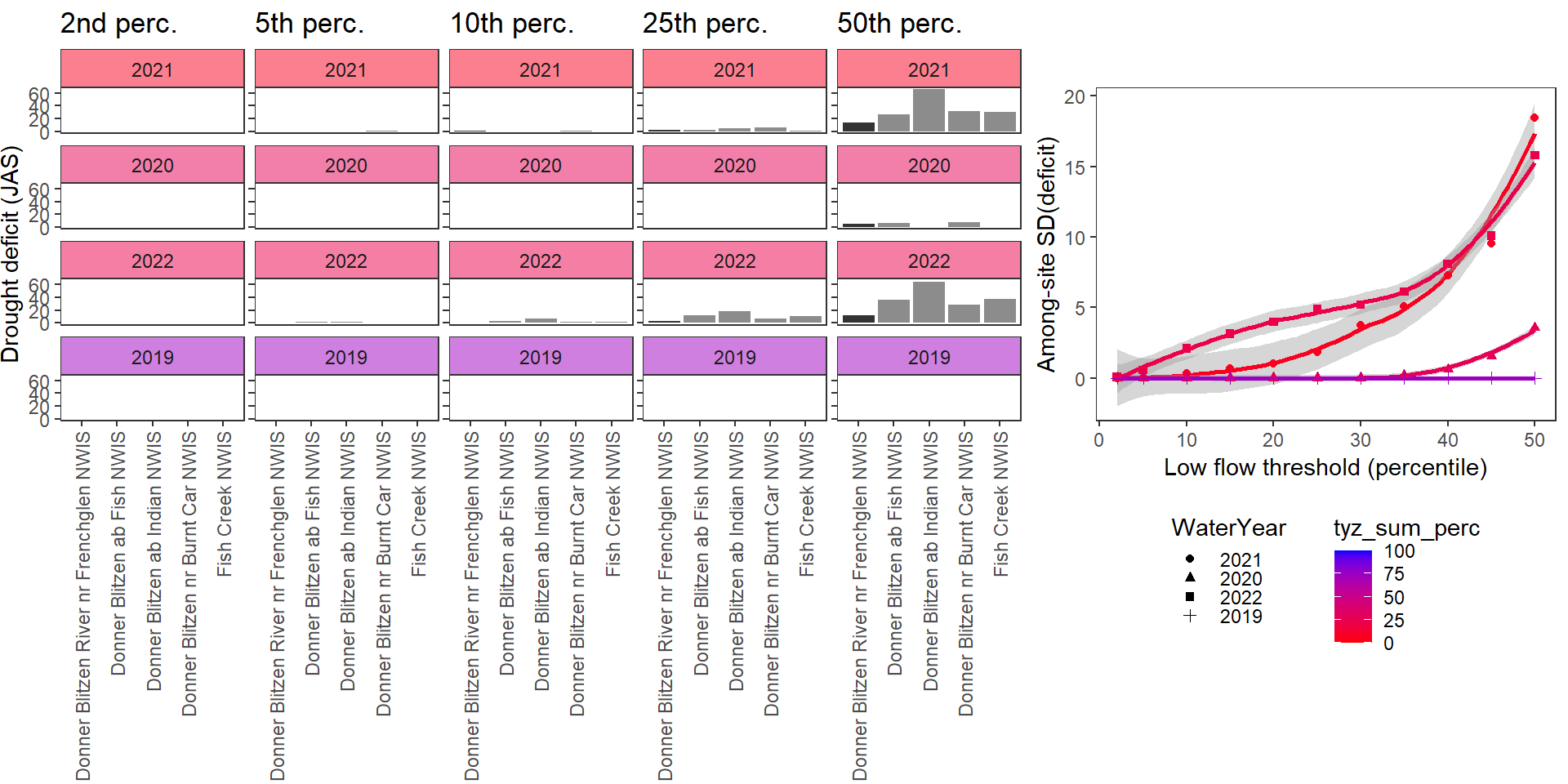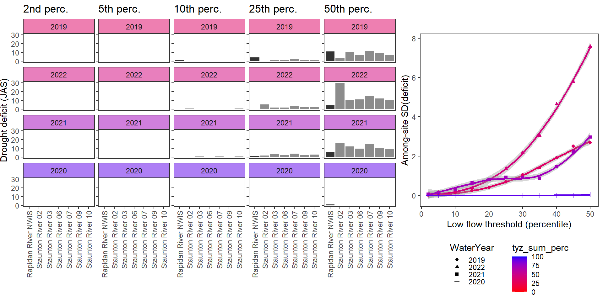 For each site individually, generate (fixed) drought/low flow thresholds using the same quantiles same as above: ~0.05 increments from 0.02 to 0.50. Restrict data to selected basins, sites, and years with (nearly) complete summer (July, August, September) data over the selected periods/locations. (Standardization needs to be done over comparable time periods, at least among sites within basins).