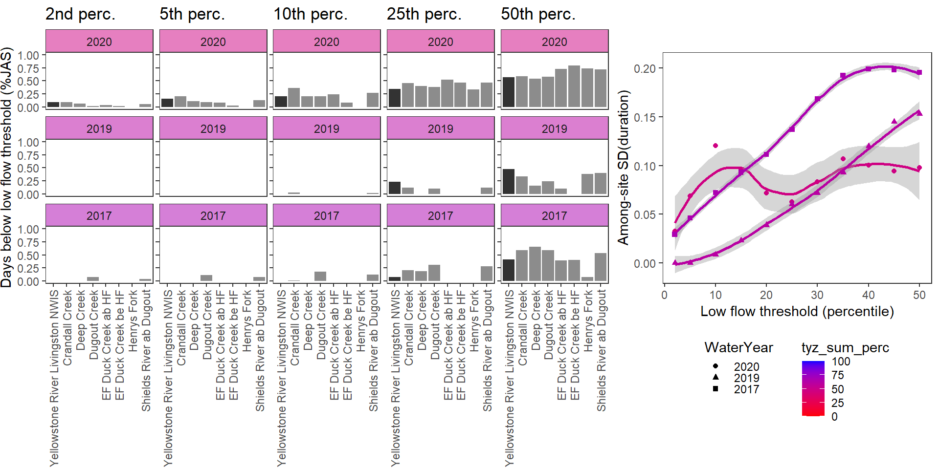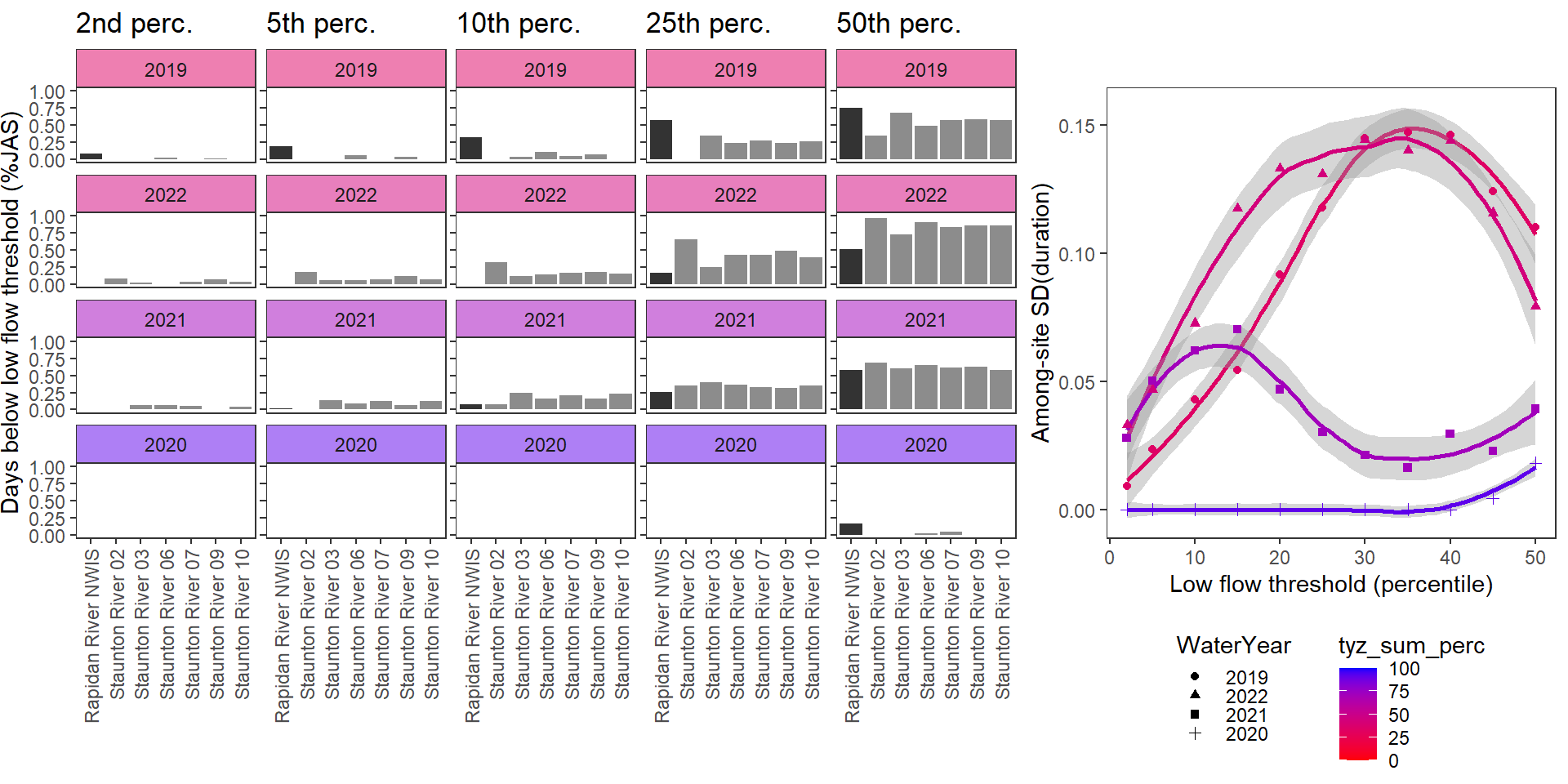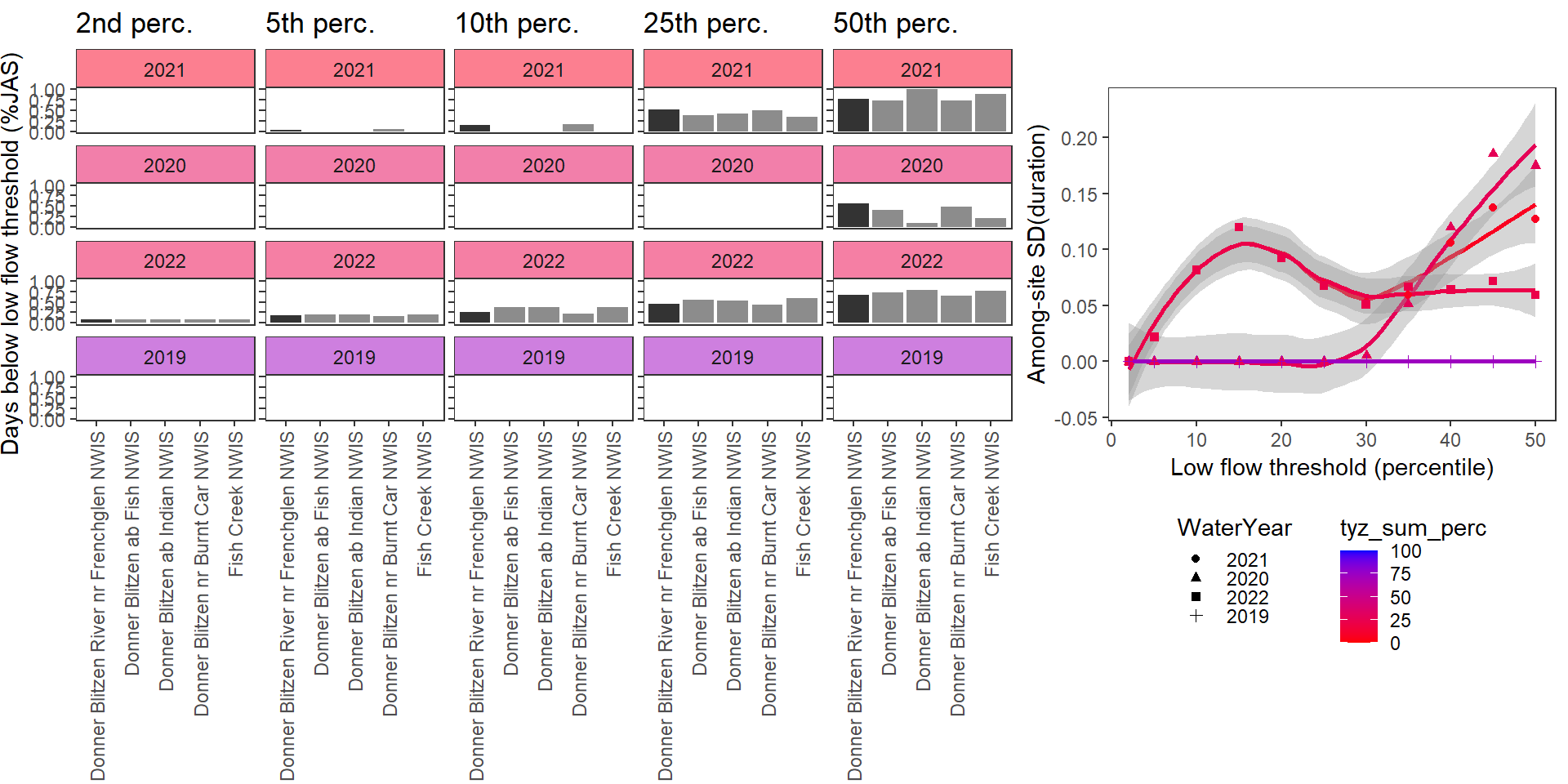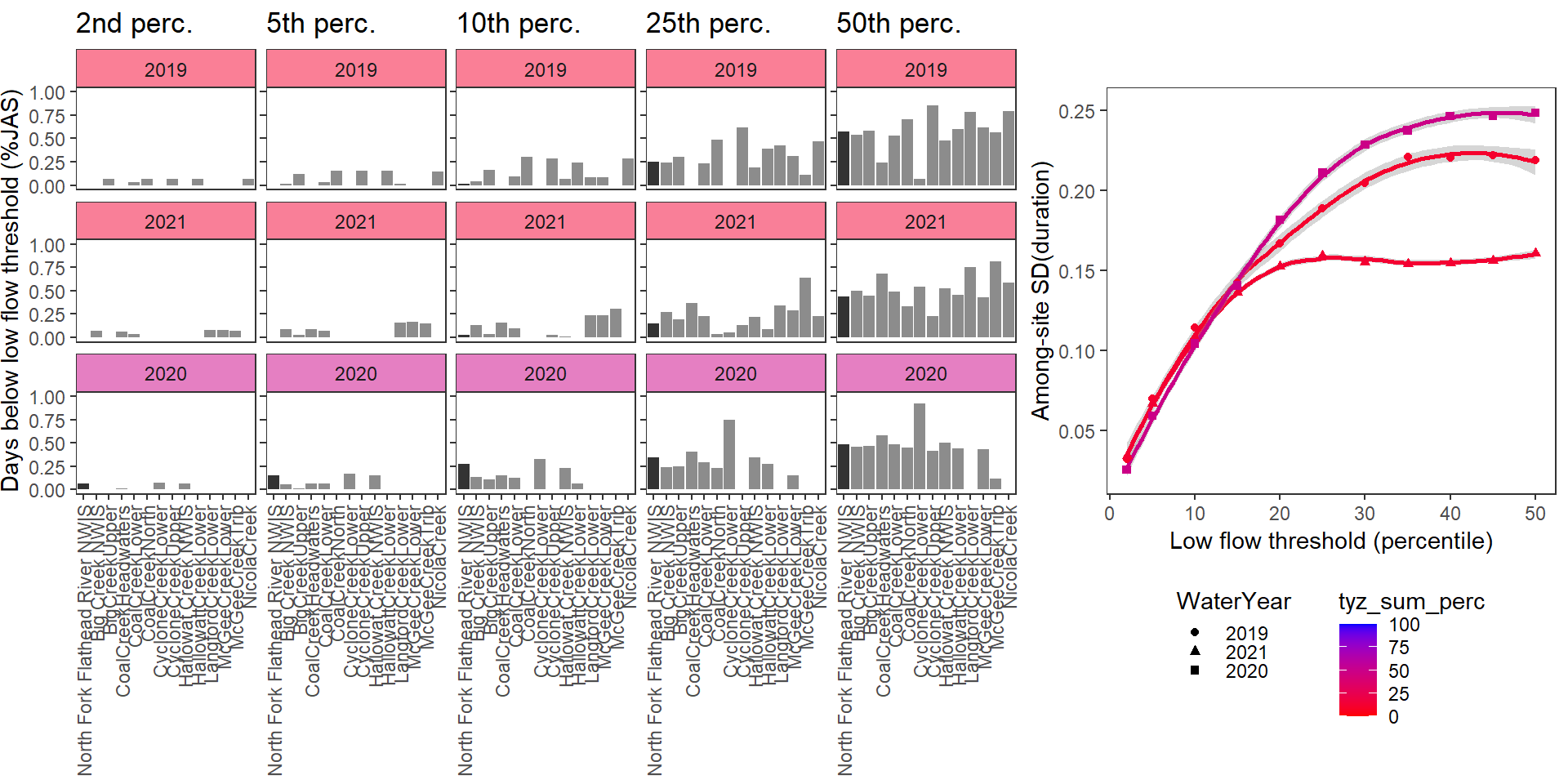 For each site individually, generate (fixed) drought/low flow thresholds using the same quantiles same as above: ~0.05 increments from 0.02 to 0.50. Restrict data to selected basins, sites, and years with (nearly) complete summer (July, August, September) data over the selected periods/locations. (Standardization needs to be done over comparable time periods, at least among sites within basins).