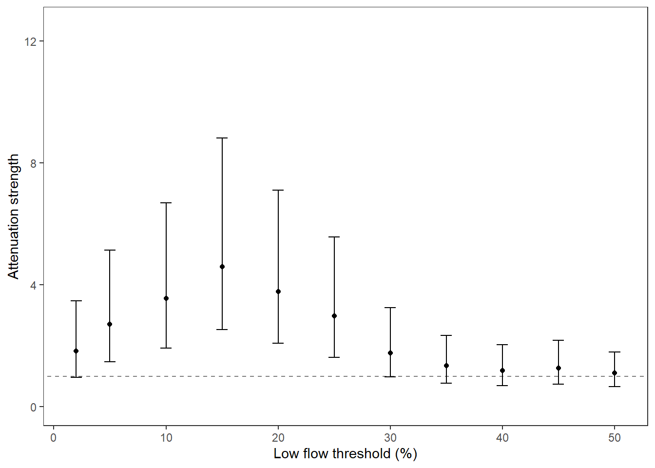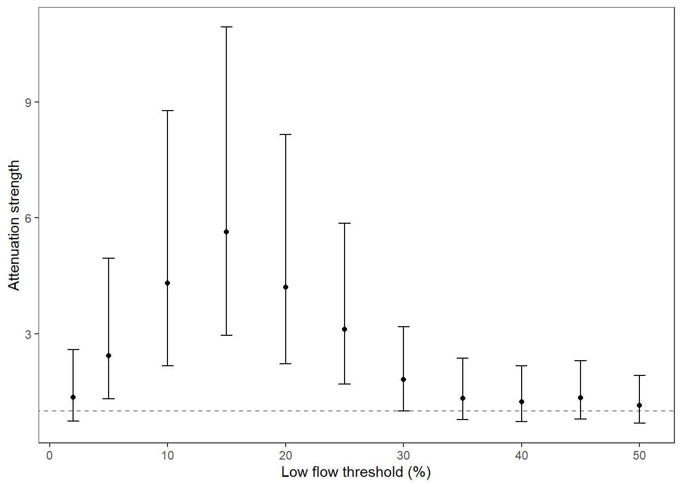 xlab("Critical flow threshold (percentile)") + ylab("Attenuation strength")