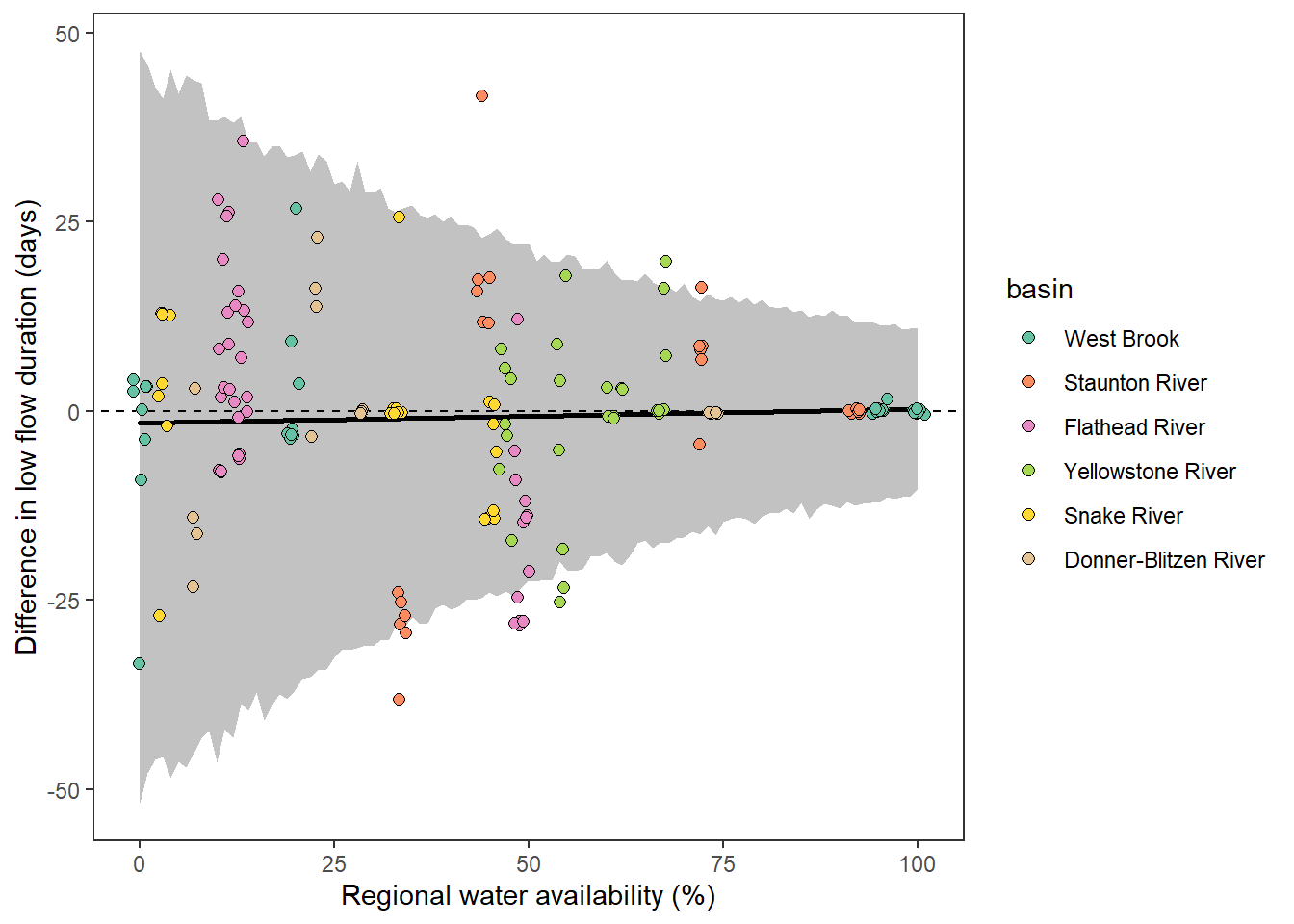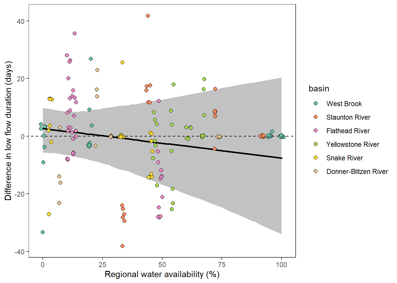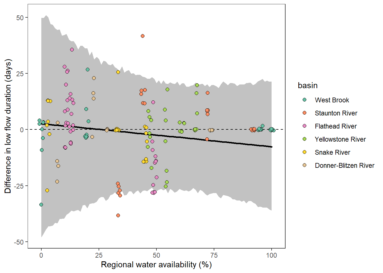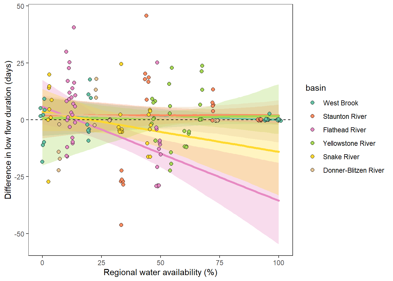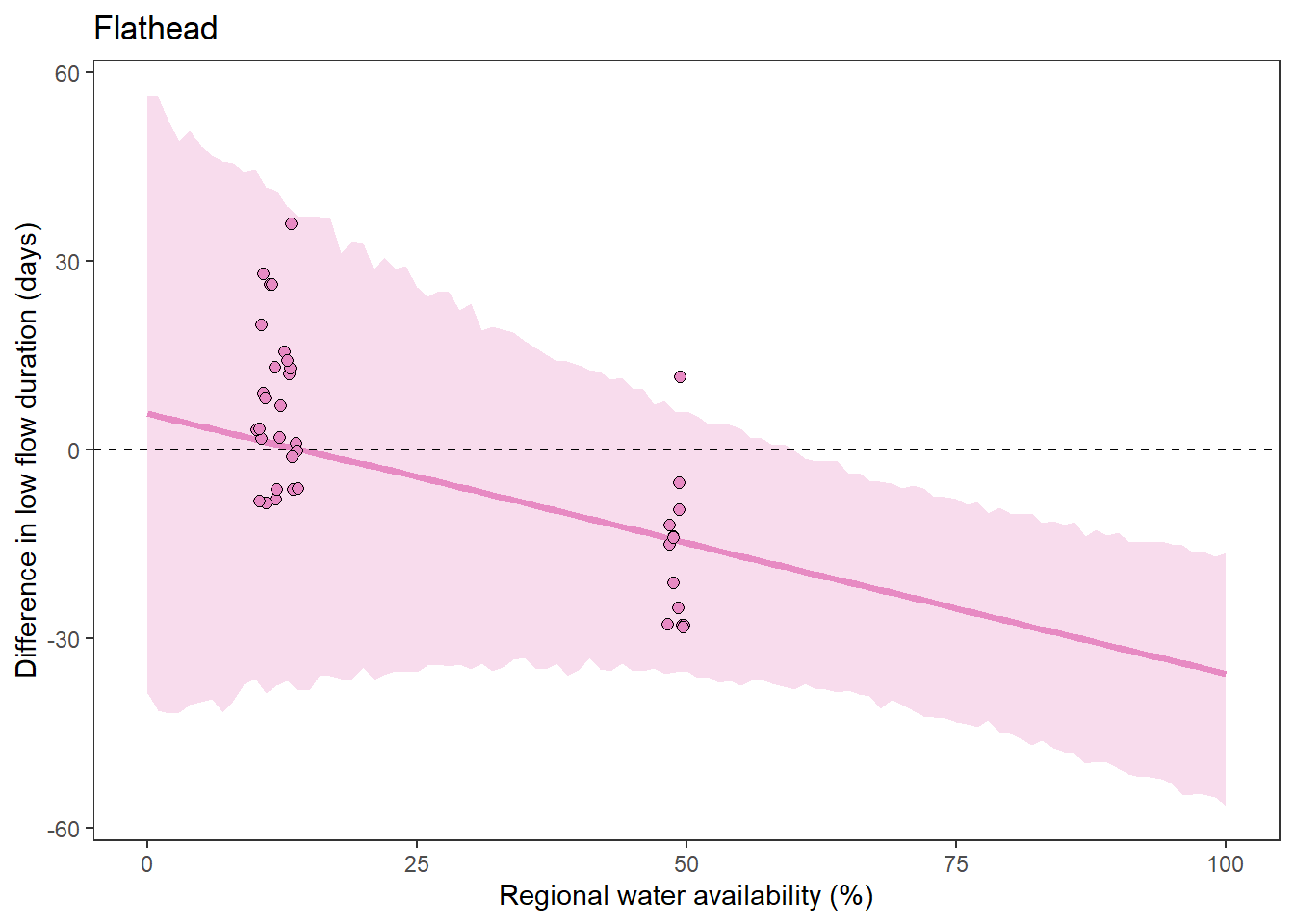 xlab("Regional water availability (%)") + ylab("Difference in low flow duration (days)") + ggtitle("Flathead")