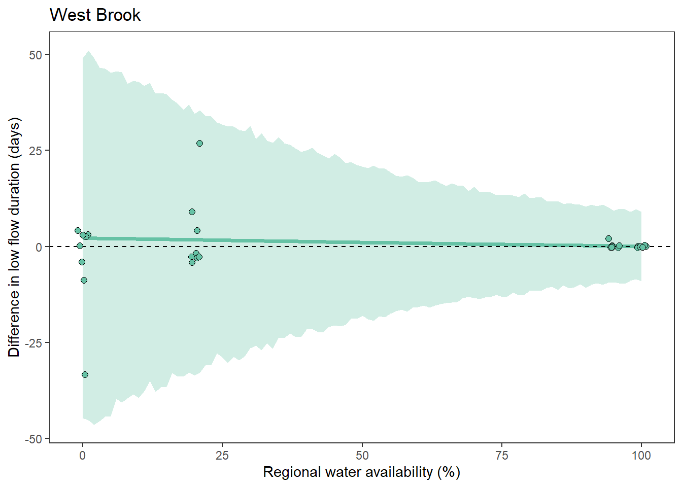 xlab("Regional water availability (%)") + ylab("Difference in low flow duration (days)") + ggtitle("West Brook")