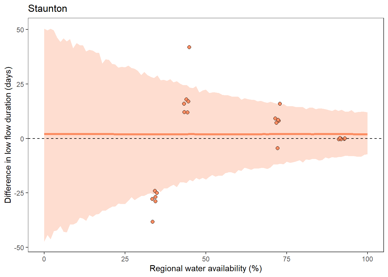 xlab("Regional water availability (%)") + ylab("Difference in low flow duration (days)") + ggtitle("Staunton")