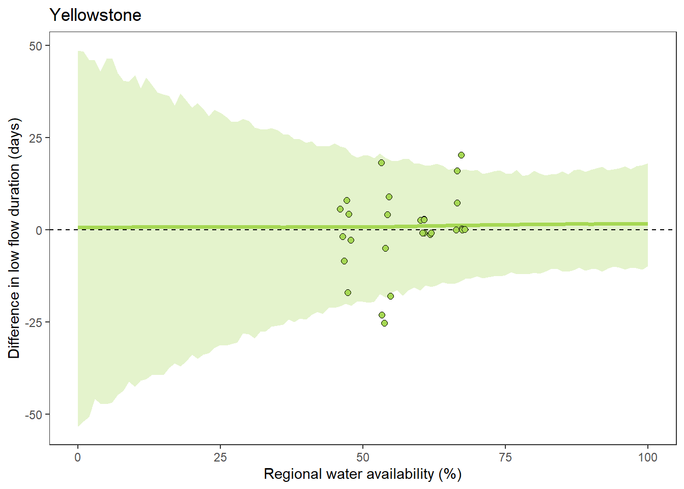 xlab("Regional water availability (%)") + ylab("Difference in low flow duration (days)") + ggtitle("Yellowstone")