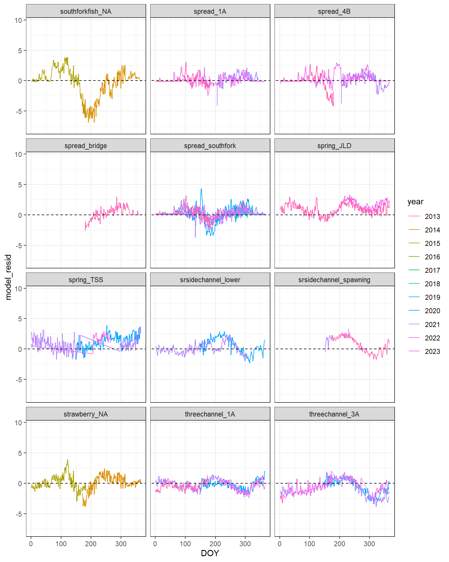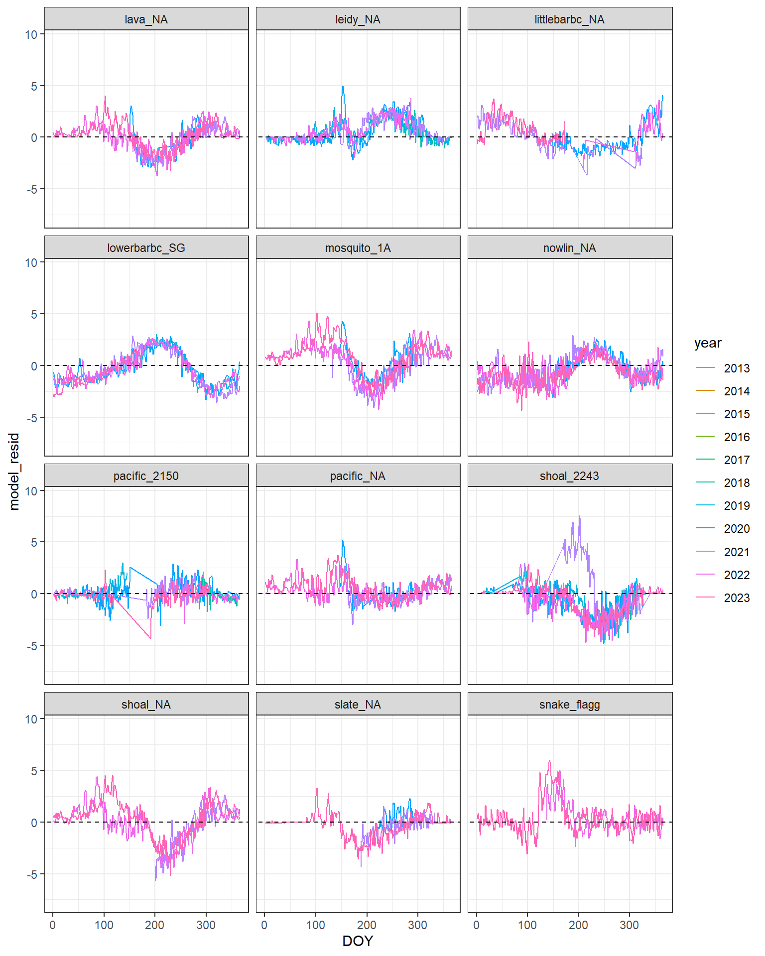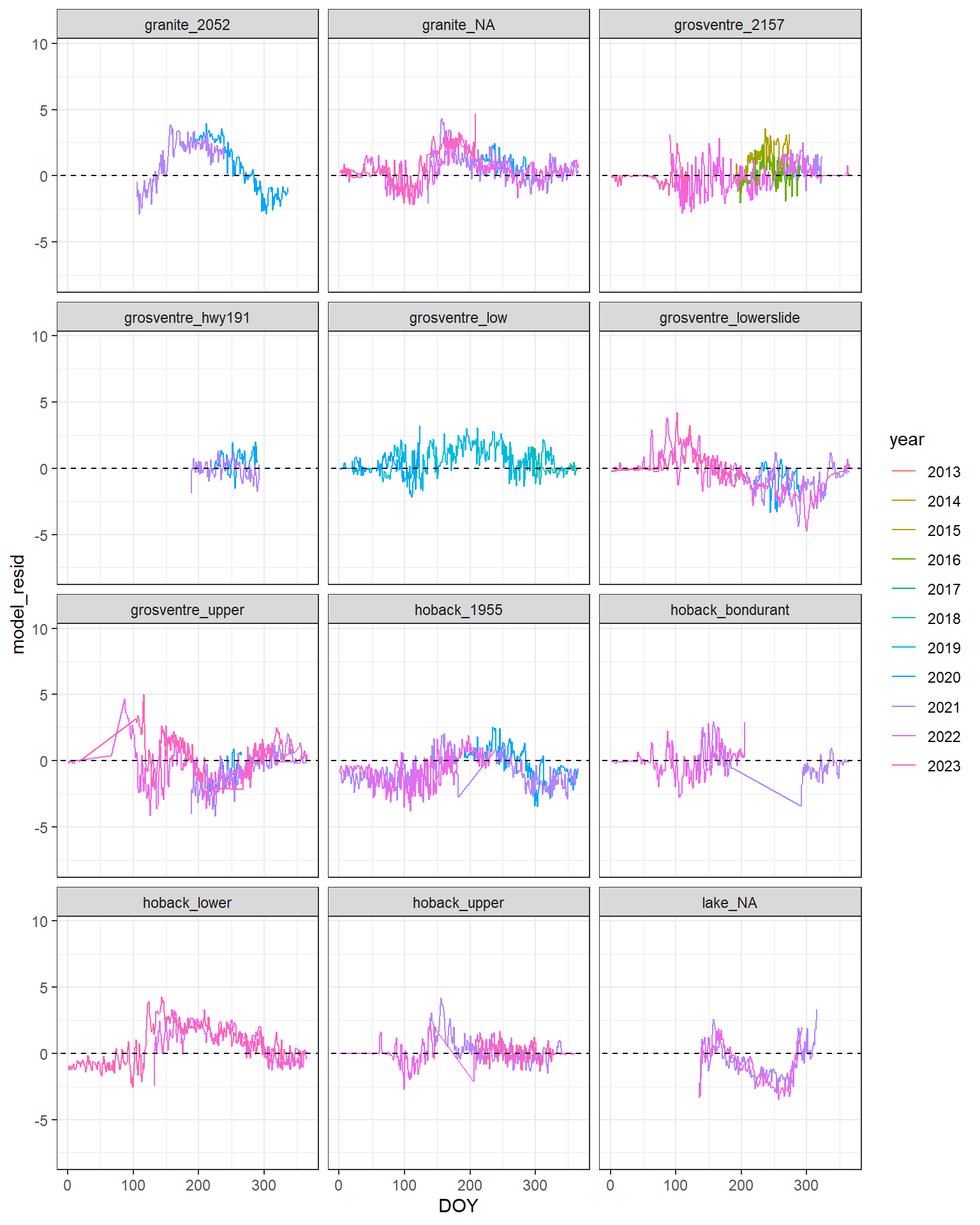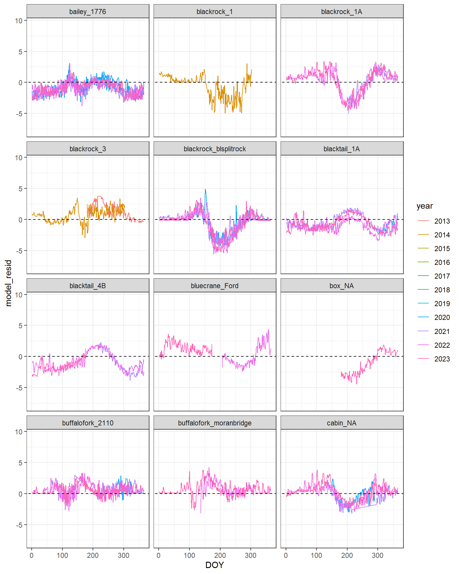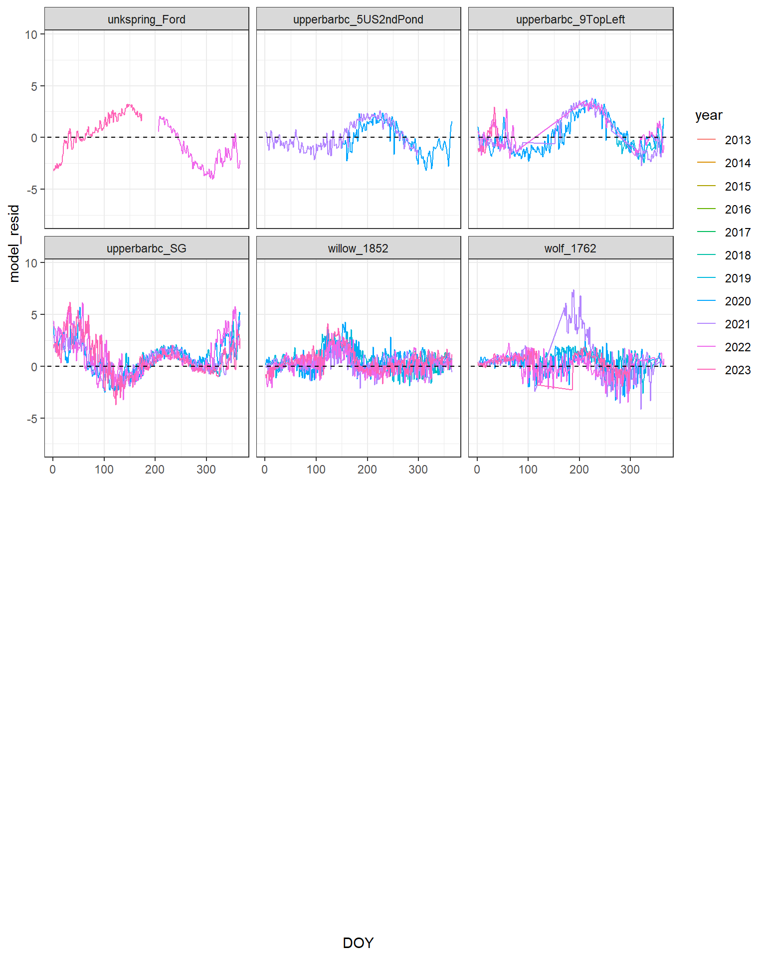 Purpose: Explore the relationship between residuals from K. Gauthier’s daily stream temperature model and independent metrics of groundwater availability. This is somewhat complicated by the fact that Kevin’s model already uses groundwater availability as a covariate, so we really aren’t evaluating how much additional information the groundwater metric adds, but rather the variance that isn’t explained by the existing metric (e.g., driven by spatial/temporal variation in groundwater temperature, lagged groundwater temperature signals, etc.).