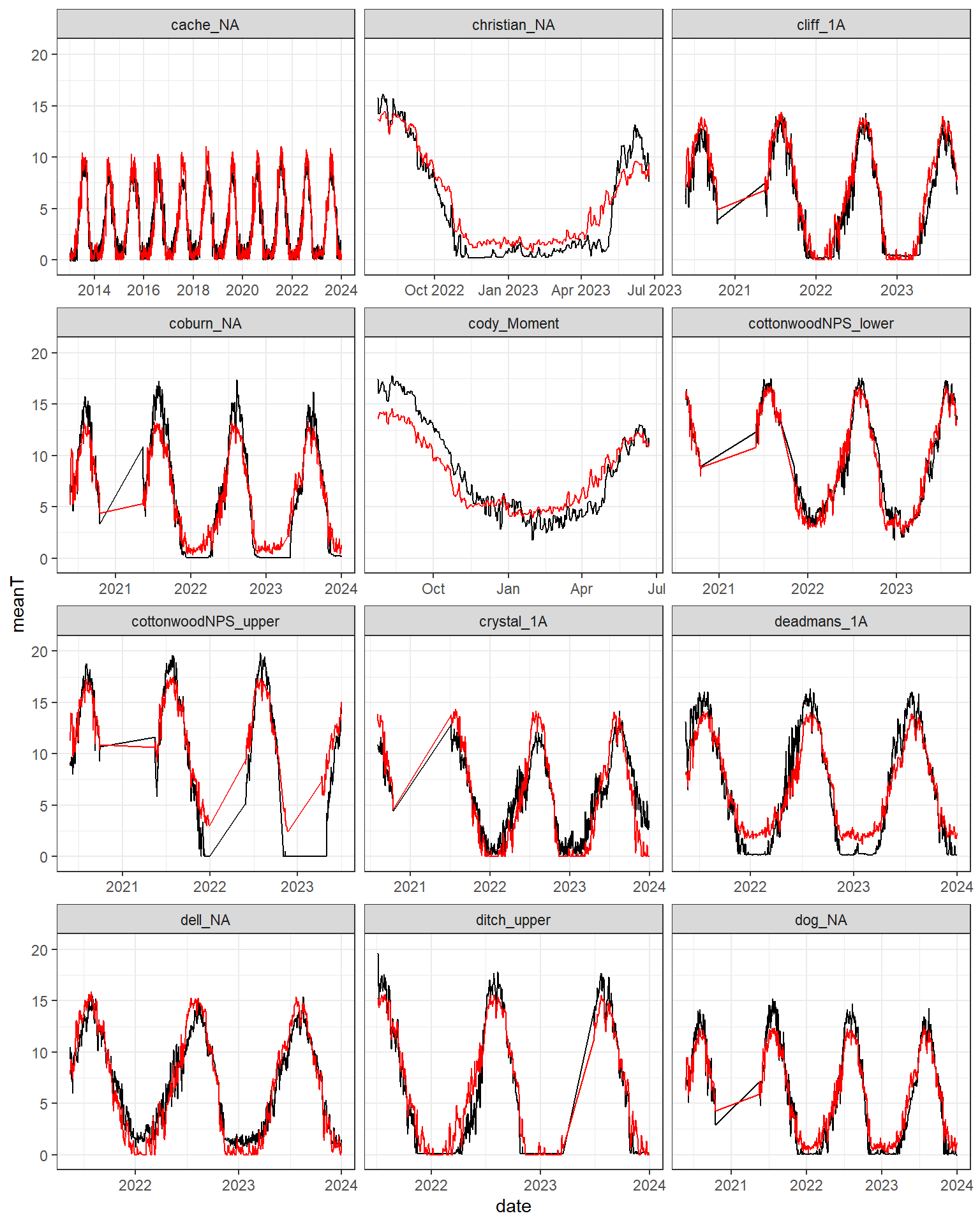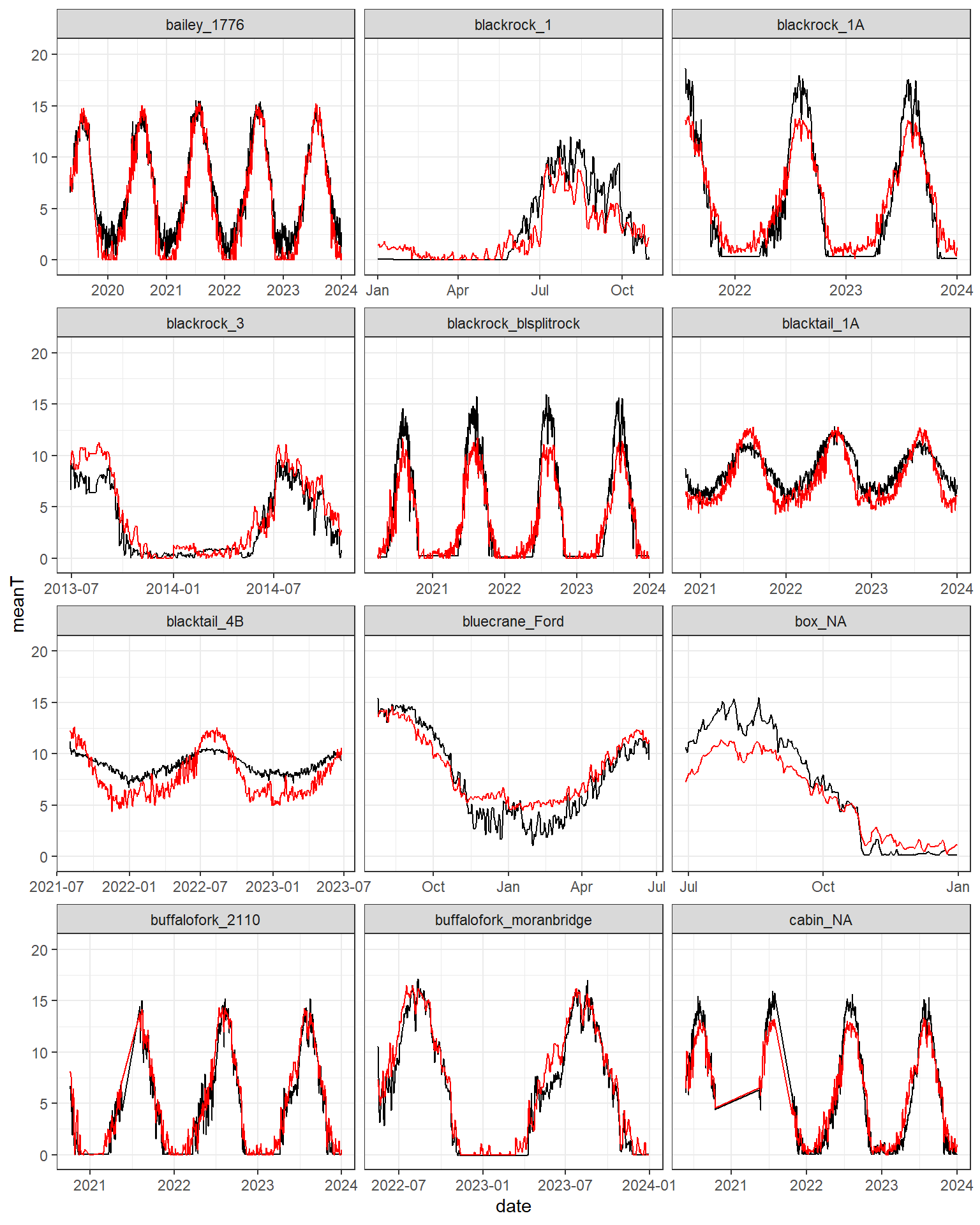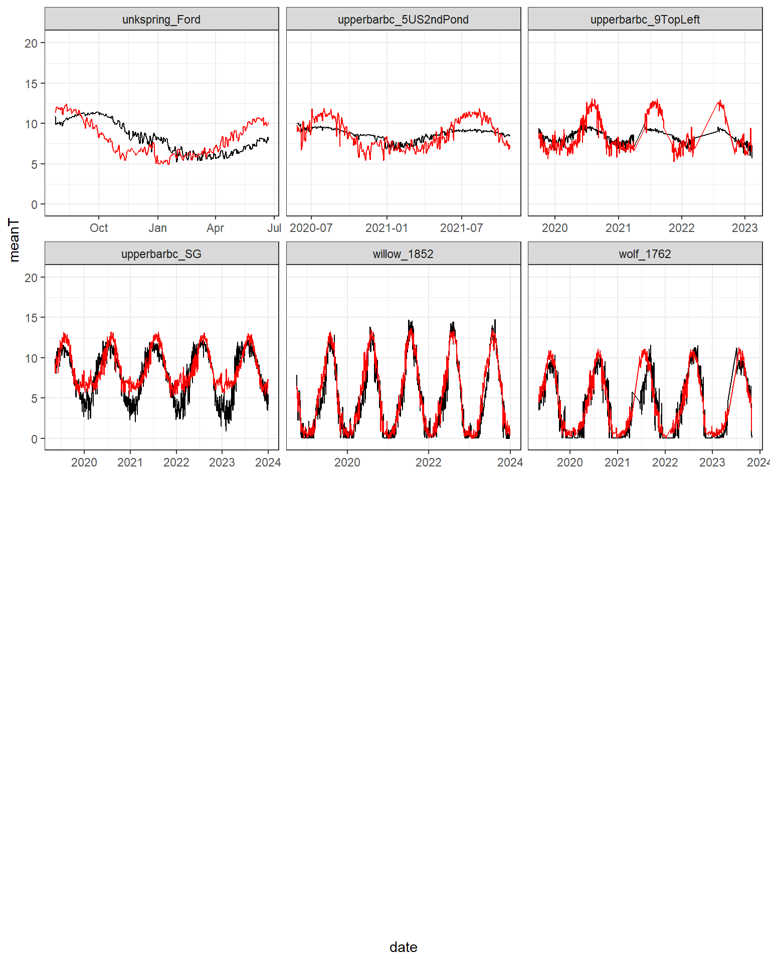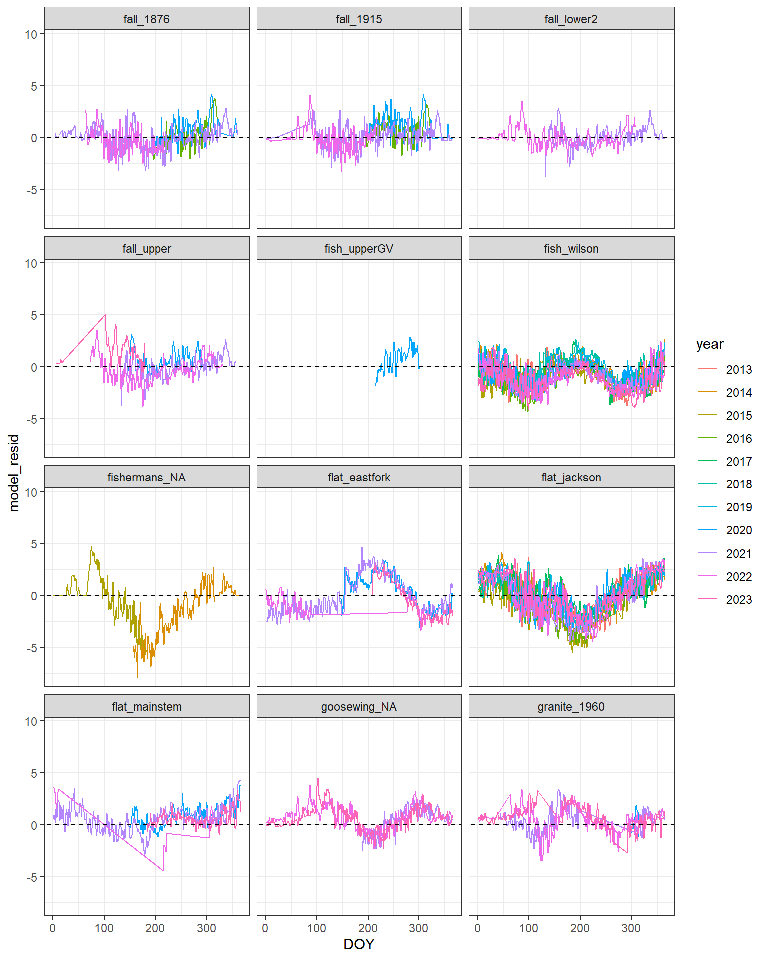 Purpose: Explore the relationship between residuals from K. Gauthier’s daily stream temperature model and independent metrics of groundwater availability. This is somewhat complicated by the fact that Kevin’s model already uses groundwater availability as a covariate, so we really aren’t evaluating how much additional information the groundwater metric adds, but rather the variance that isn’t explained by the existing metric (e.g., driven by spatial/temporal variation in groundwater temperature, lagged groundwater temperature signals, etc.).