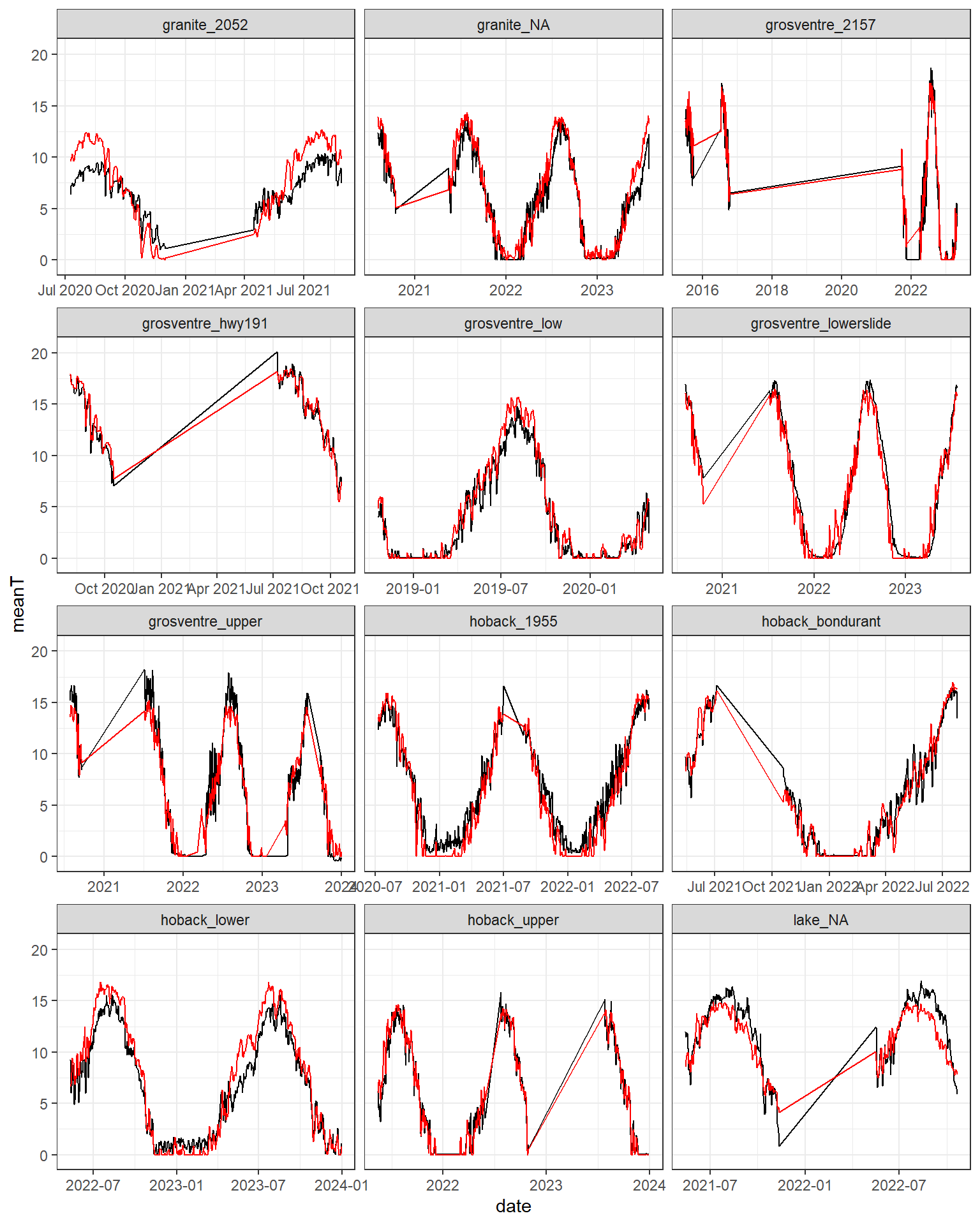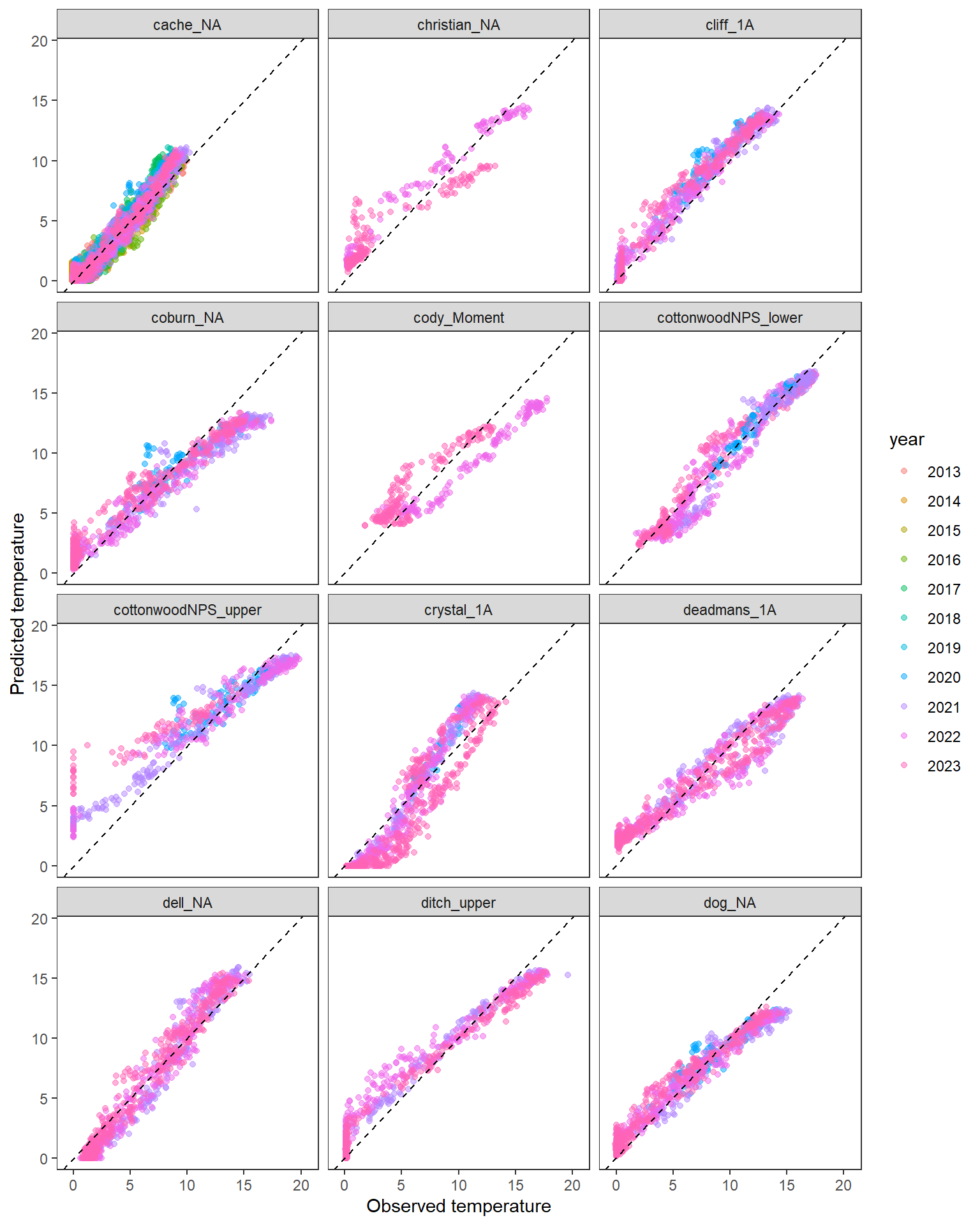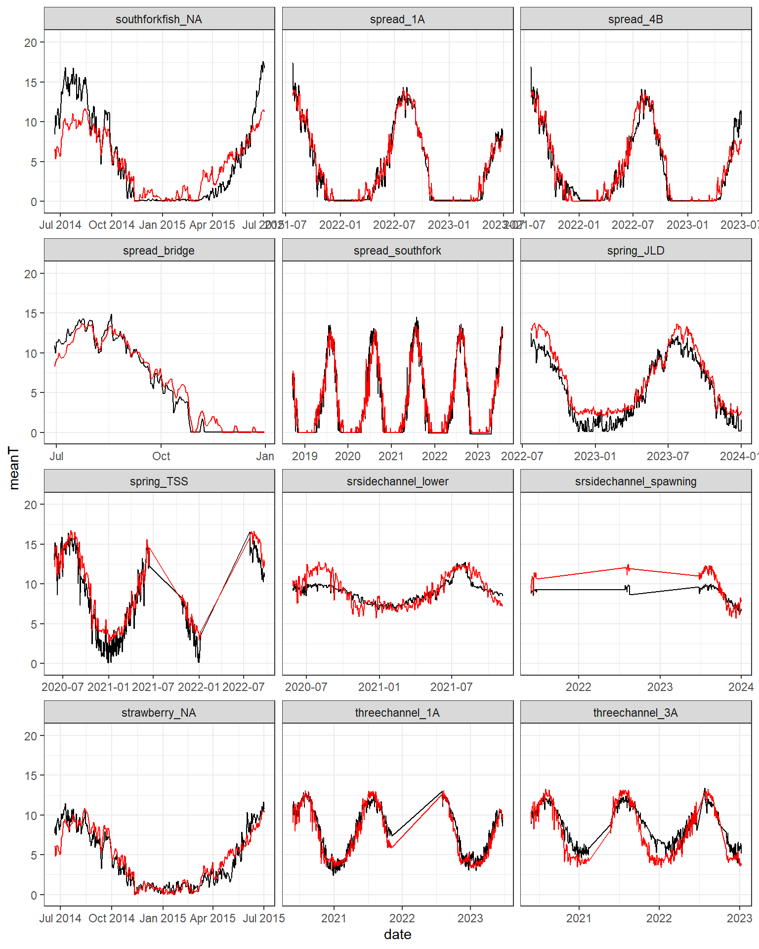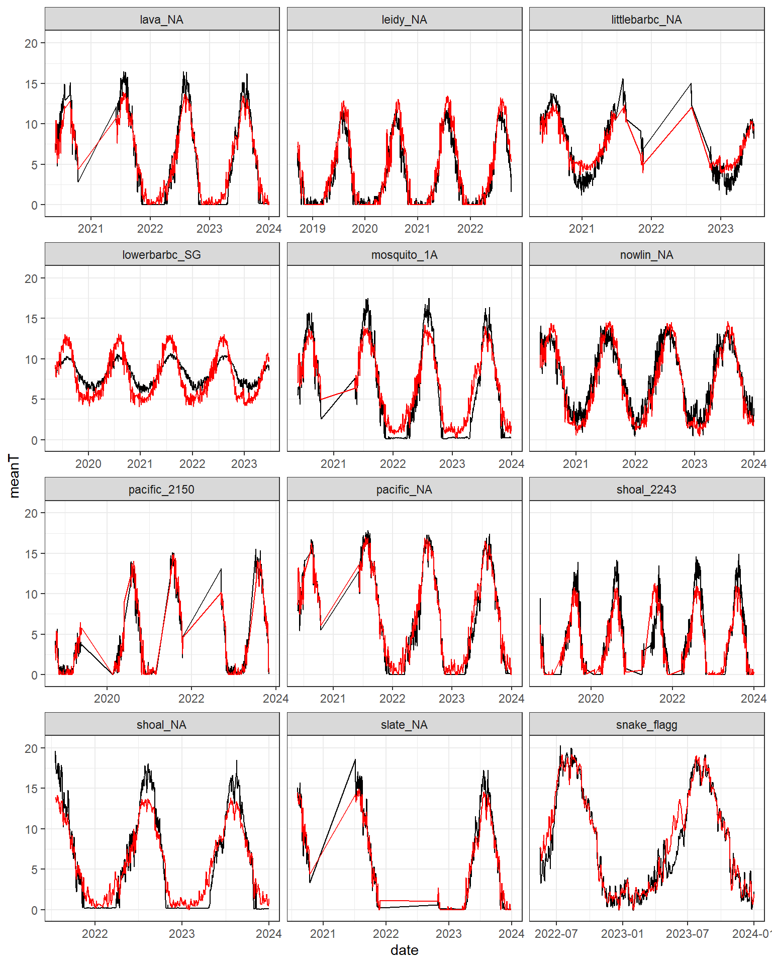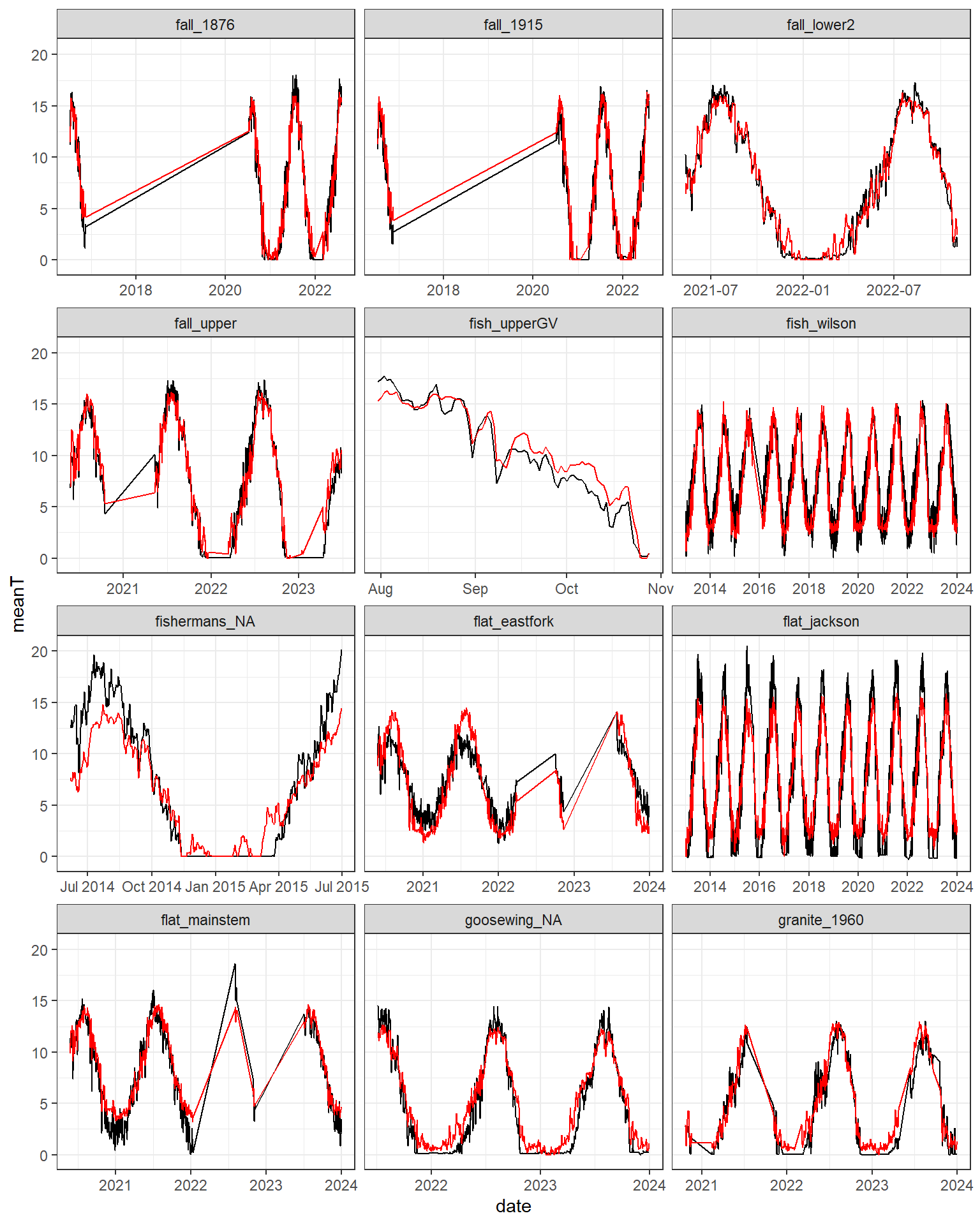 Purpose: Explore the relationship between residuals from K. Gauthier’s daily stream temperature model and independent metrics of groundwater availability. This is somewhat complicated by the fact that Kevin’s model already uses groundwater availability as a covariate, so we really aren’t evaluating how much additional information the groundwater metric adds, but rather the variance that isn’t explained by the existing metric (e.g., driven by spatial/temporal variation in groundwater temperature, lagged groundwater temperature signals, etc.).