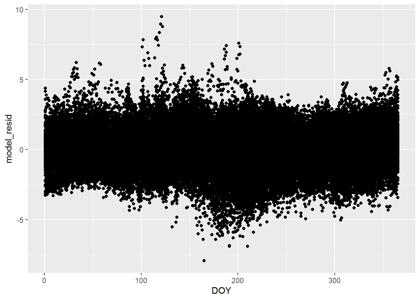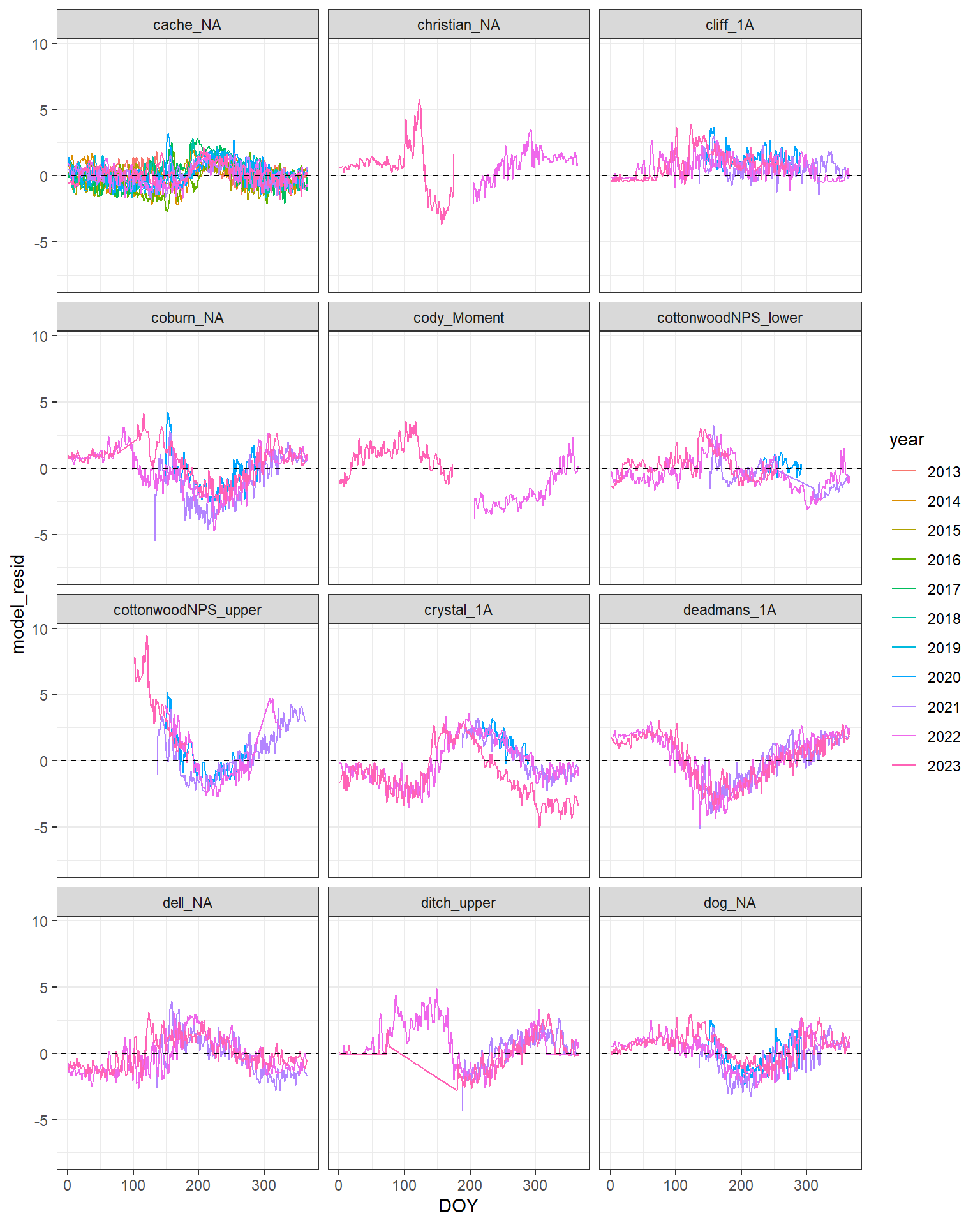 Annual pattern of residuals is generally consistent among years, within sites. Strong autocorrelation