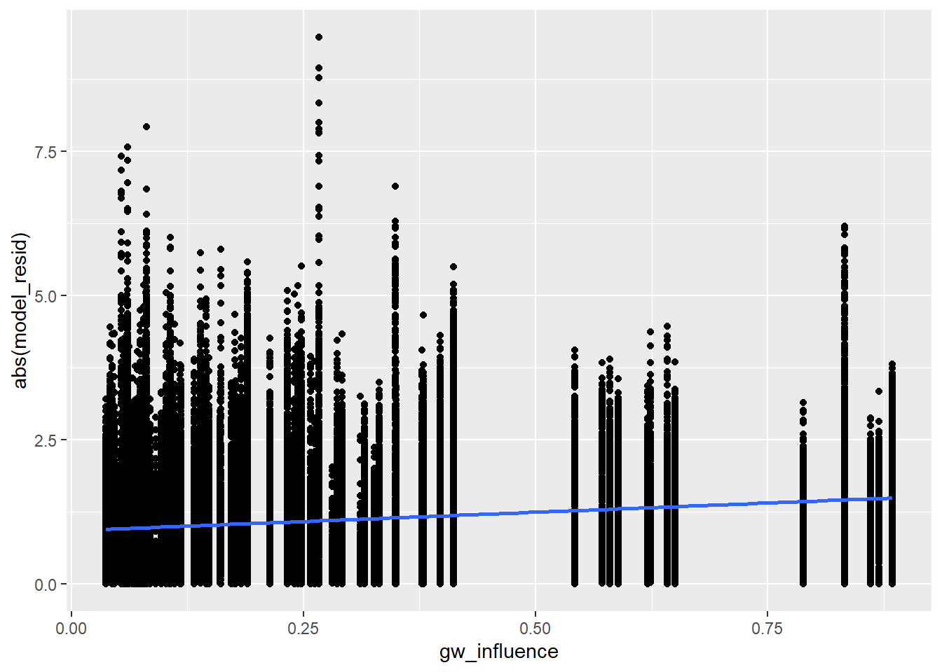 dat %>%ggplot(aes(x = gw_influence, y =abs(model_resid))) +geom_point() +theme(legend.position ="none") +geom_smooth(method ="lm")