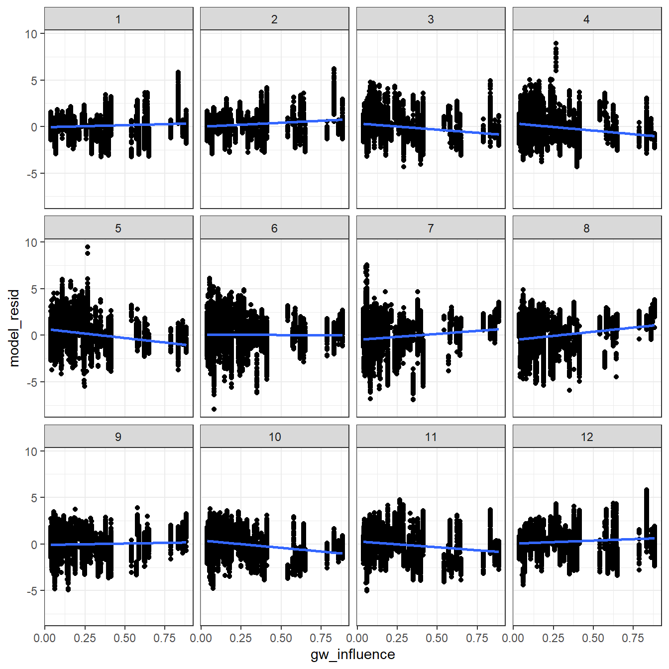 dat %>%ggplot(aes(x = gw_influence, y = model_resid)) +geom_point() +geom_smooth(method ="lm") +facet_wrap(~tim.month) +theme_bw()
