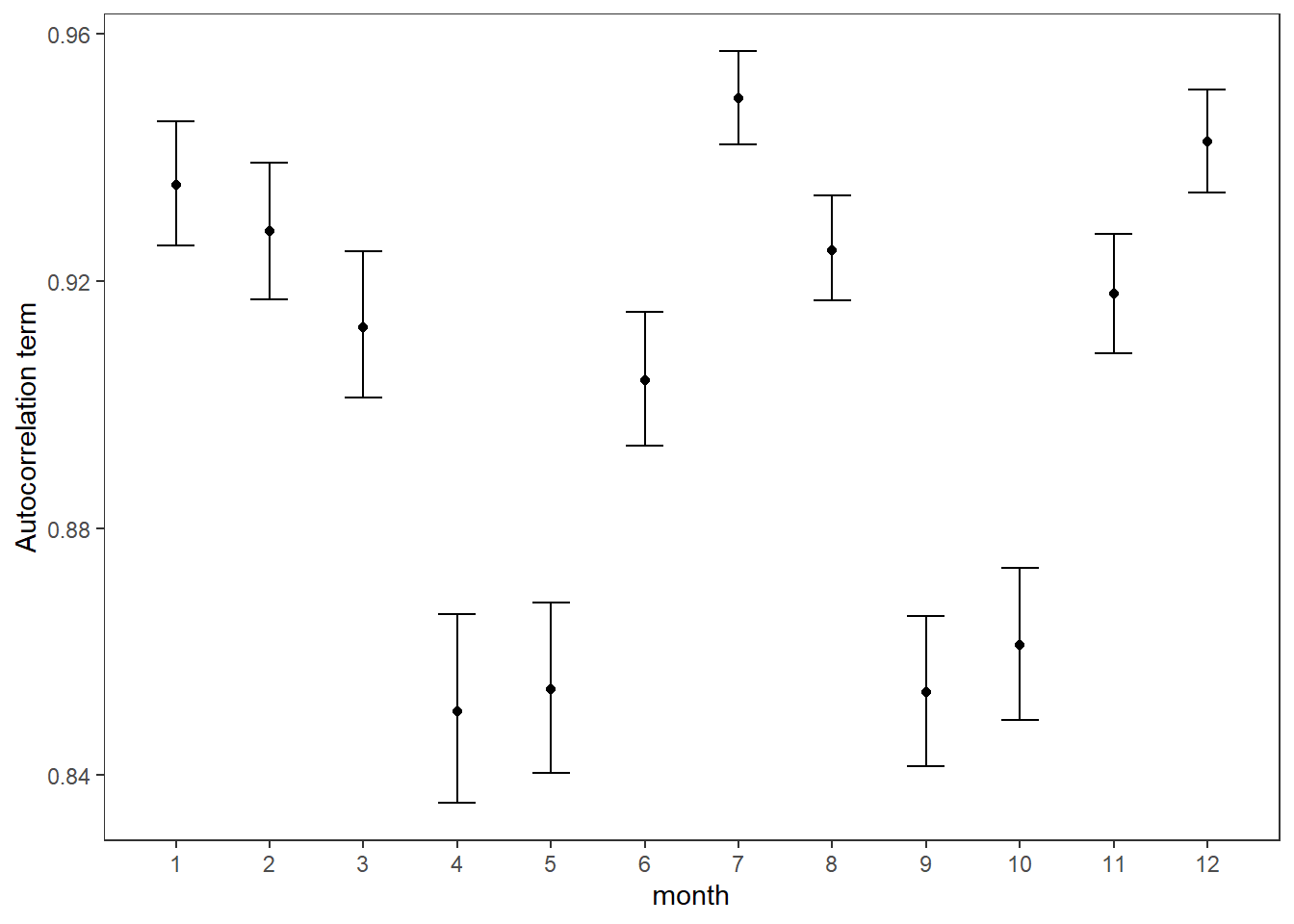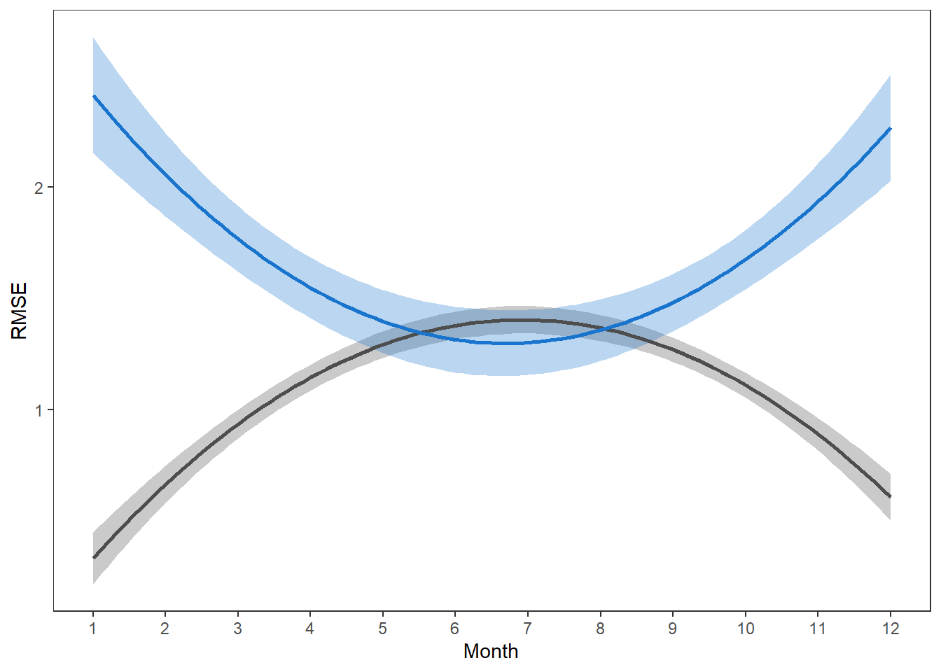Alternatively, we can model monthly RMSE, rather than the raw residuals. This eliminates the need for an autocorrelation term and is based on a coarser measure of predictive accuracy (is using/modeling all residuals pseudoreplication), but limits our ability to discriminate between under vs over-estimates/predictions.