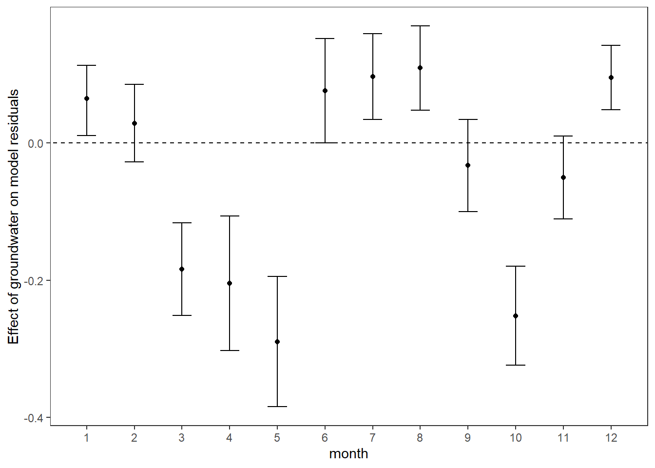 # plot groundwater effectsefftib %>%ggplot() +geom_point(aes(x = month, y = mean.gw)) +geom_errorbar(aes(x = month, ymin = lower.gw, ymax = upper.gw), width =0.4) +geom_abline(intercept =0, slope =0, linetype ="dashed") +theme_bw() +theme(panel.grid =element_blank()) +ylab("Effect of groundwater on model residuals") +scale_x_continuous(breaks =c(1:12))