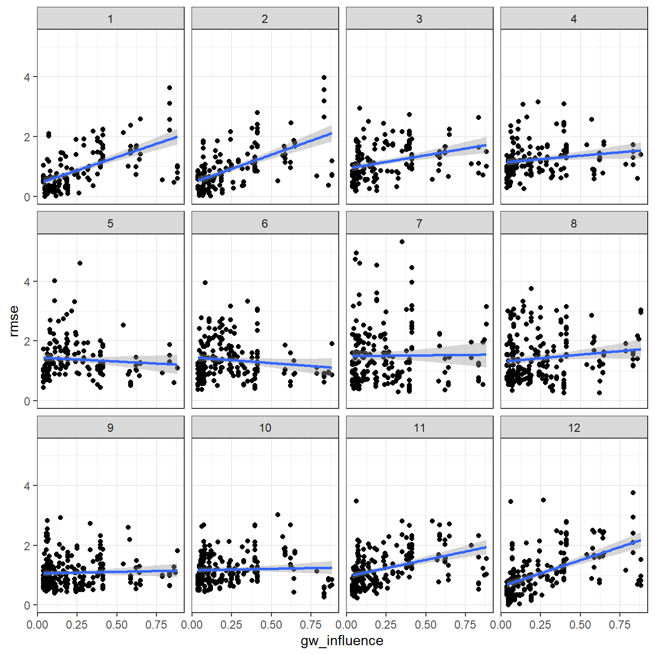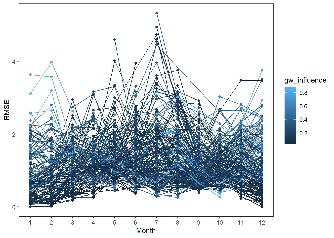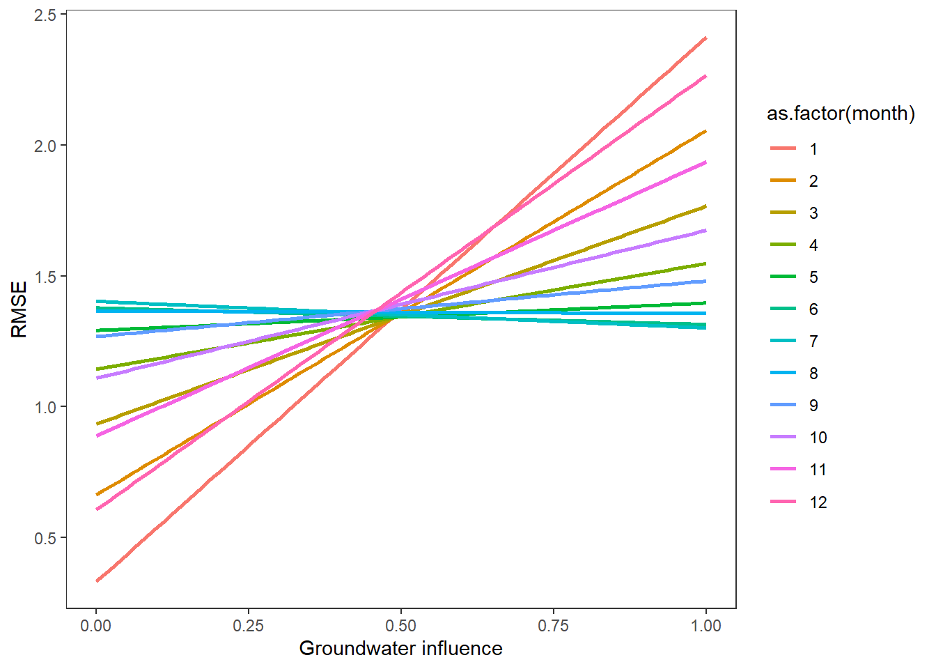 Fit linear mixed effects models in a loop, independently for each month: RMSE as a function of site-level groundwater influence and random intercepts for year