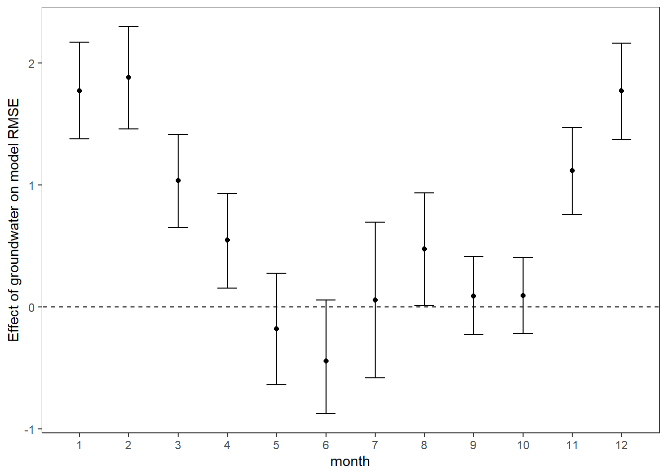 modlist <-list()for (i in1:12) { modlist[[i]] <-lmer(rmse ~ gw_influence + (1|year), data = errorterms %>%filter(tim.month == i))}# empty tibble to store coefficientsefftib <-tibble(month =1:12, mean.gw =rep(NA, 12),lower.gw =rep(NA, 12),upper.gw =rep(NA, 12))# get coefficients, means and 95% confidence intervalsfor (i in1:12) { efftib$mean.gw[i] <-fixef(modlist[[i]])[2] efftib$lower.gw[i] <-confint(modlist[[i]])[4,1] efftib$upper.gw[i] <-confint(modlist[[i]])[4,2]}# plot groundwater effectsefftib %>%ggplot() +geom_point(aes(x = month, y = mean.gw)) +geom_errorbar(aes(x = month, ymin = lower.gw, ymax = upper.gw), width =0.4) +geom_abline(intercept =0, slope =0, linetype ="dashed") +theme_bw() +theme(panel.grid =element_blank()) +ylab("Effect of groundwater on model RMSE") +scale_x_continuous(breaks =c(1:12))