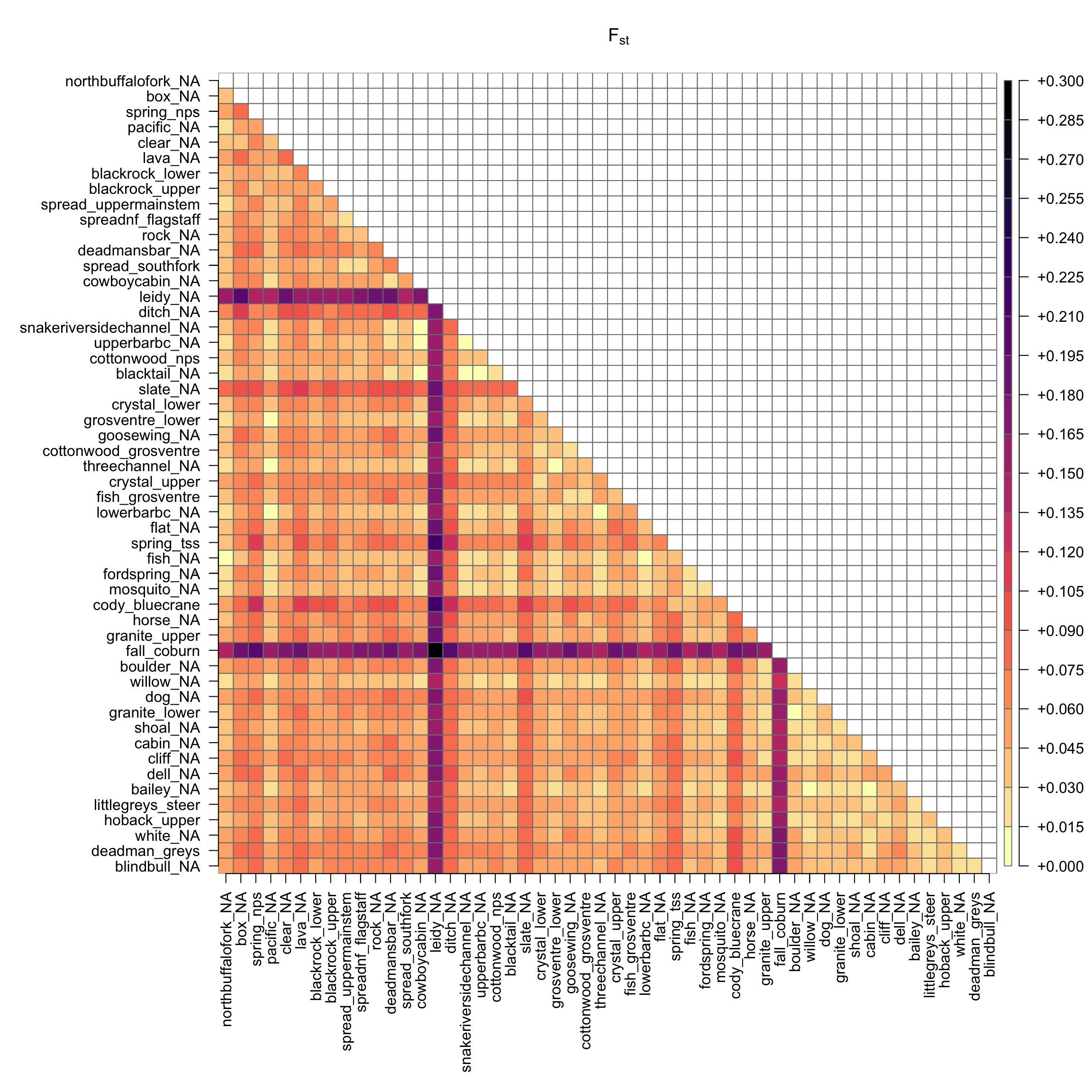 jpeg("/Users/jeffbaldock/Library/CloudStorage/GoogleDrive-jbaldock@uwyo.edu/Shared drives/wyo-coop-baldock/UWyoming/Snake River Cutthroat/Analyses/Snake River GSI Quarto/Baseline Fst/BaselinePopsFst_colormatrix_byLat_numbered.jpg", res =1000, units ="in", width =10, height =10)par(mar =c(2.5,2.5,4,4))plot(as.matrix(r2), main =expression("F"["st"]), col =rev(magma(20)), las =2, xlab ="", ylab ="", axes =F, border ="grey50")axis(1, cex.axis =0.2)axis(2, cex.axis =0.2)dev.off()