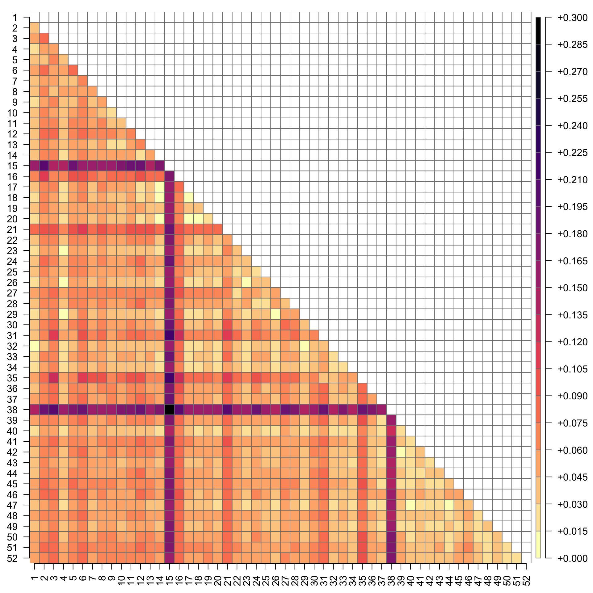# plot color matrix of Fstrownames(r2)<-1:dim(r2)[1]colnames(r2)<-1:dim(r2)[1]par(mar =c(2.5,2.5,1,4))plot(as.matrix(r2), main ="", col =rev(magma(20)), las =2, xlab ="", ylab ="", axes =F, border ="grey50")axis(1, cex.axis =0.2)axis(2, cex.axis =0.2)