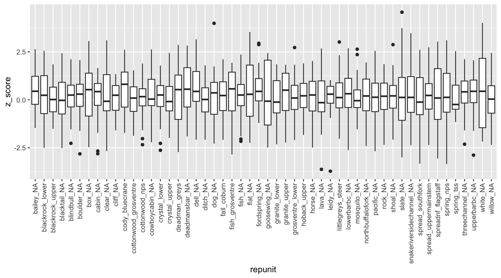 all_input$repunit[which(all_input$repunit=="bluecrane_ford")]<-"cody_bluecrane"all_input$repunit[which(all_input$repunit=="cody_moment")]<-"cody_bluecrane"all_input$repunit[which(all_input$repunit=="cowboycabin_springchannels")]<-"cowboycabin_NA"all_input$repunit[which(all_input$repunit=="threechannel_eastfork")]<-"threechannel_NA"all_input$repunit[which(all_input$repunit=="threechannel_westfork")]<-"threechannel_NA"all_input$repunit[which(all_input$repunit=="fish_lower")]<-"fish_NA"all_input$repunit[which(all_input$repunit=="fish_upper")]<-"fish_NA"all_input$repunit[which(all_input$repunit=="slate_lower")]<-"slate_NA"all_input$repunit[which(all_input$repunit=="slate_upper")]<-"slate_NA"all_input$repunit[which(all_input$repunit=="spread_northfork")]<-"spreadnf_flagstaff"all_input$repunit[which(all_input$repunit=="flagstaff_NA")]<-"spreadnf_flagstaff"all_input$repunit[which(all_input$repunit=="fall_upper")]<-"fall_coburn"all_input$repunit[which(all_input$repunit=="fall_lower")]<-"fall_coburn"all_input$repunit[which(all_input$repunit=="coburn_NA")]<-"fall_coburn"all_input$repunit[which(all_input$repunit=="littlegreys_lower")]<-"littlegreys_steer"all_input$repunit[which(all_input$repunit=="littlegreys_upper")]<-"littlegreys_steer"all_input$repunit[which(all_input$repunit=="steer_NA")]<-"littlegreys_steer"all_input$repunit[which(all_input$repunit=="pacific_lower")]<-"pacific_NA"all_input$repunit[which(all_input$repunit=="pacific_upper")]<-"pacific_NA"# drop reporting groups that cannot be easily combinedall_input<-all_input%>%filter(!repunit%in%c("schwabacher_NA", "southbuffalofork_NA", "jack_NA", "bacon_NA", "bear_NA", "sheep_NA"))