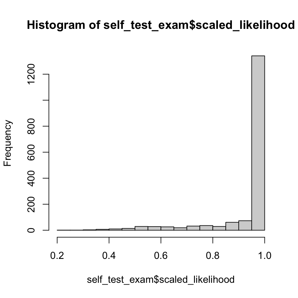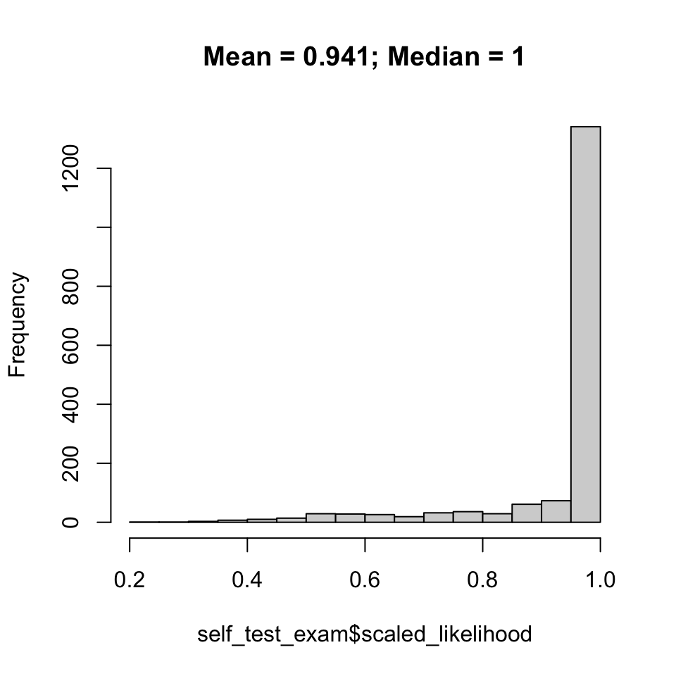 plot(p1, main =paste(paste("Mean = ", round(mean(self_test_exam$scaled_likelihood), digits =3), "; Median = ", round(median(self_test_exam$scaled_likelihood), digits =3), sep ="")))