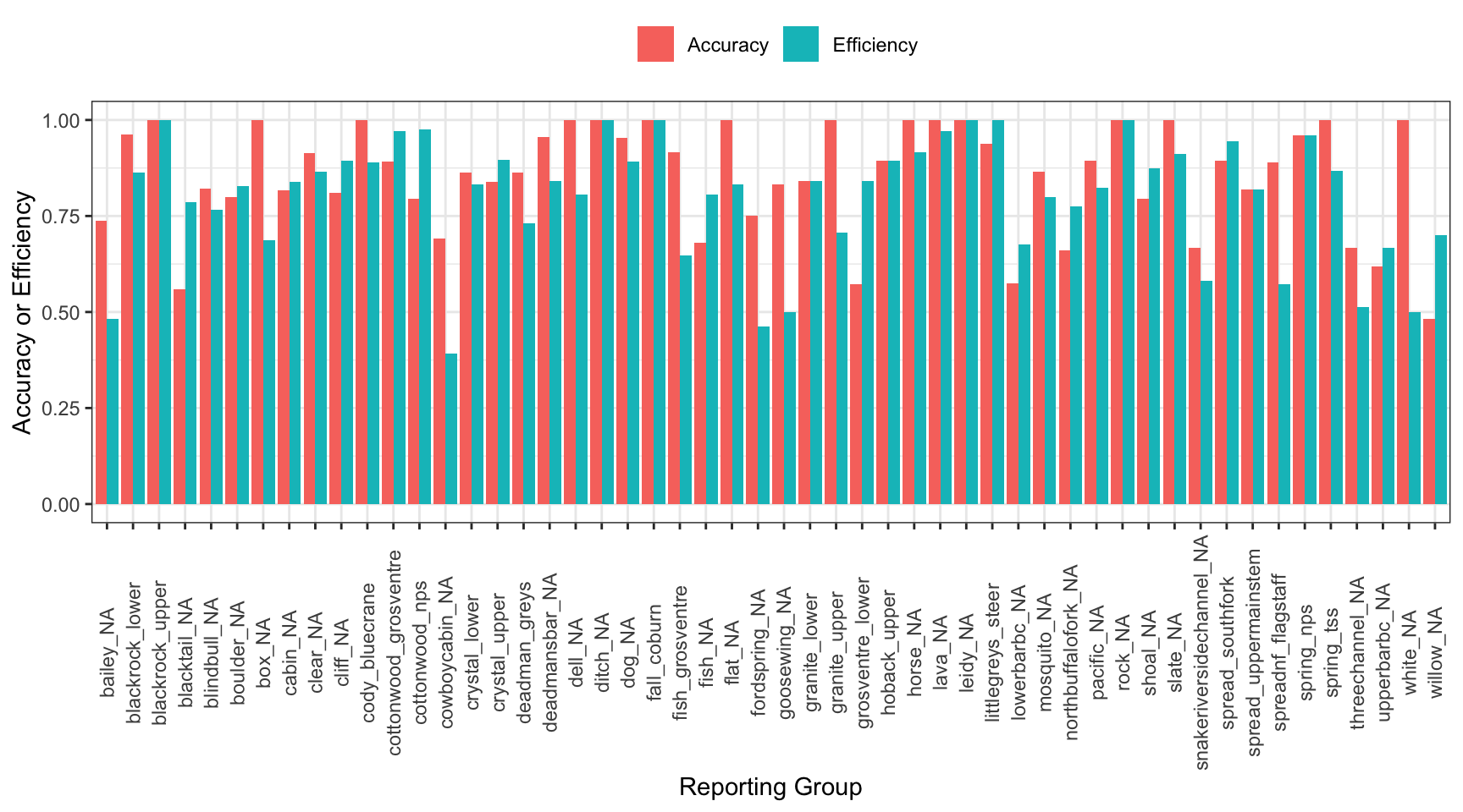 # summarize results by reporting groupref_pops<-unique(self_test_exam$repunit)prop_assigned_acc<-rep(NA, length(ref_pops))prop_assigned_eff<-rep(NA, length(ref_pops))sampsize<-rep(NA, length(ref_pops))selfassprop<-tibble(ref_pops, prop_assigned_acc, prop_assigned_eff, sampsize)for(iin1:dim(selfassprop)[1]){corass<-self_test_exam[which(self_test_exam$repunit==ref_pops[i]),]# fish known to be from a given reporting unittotass<-self_test_exam[which(self_test_exam$inferred_repunit==ref_pops[i]),]# fish assigned to a given reporting unitselfassprop$prop_assigned_eff[i]<-length(which(corass$repunit==corass$inferred_repunit))/nrow(corass)# Efficiency - the number of individuals known to belong to a reporting group which were recovered from the mixtureselfassprop$prop_assigned_acc[i]<-length(which(totass$repunit==totass$inferred_repunit))/nrow(totass)# Accuracy - the proportion of individuals correctly assigned to a reporting groupselfassprop$sampsize[i]<-nrow(corass)}# add coordinates for sortingselfassprop<-selfassprop%>%left_join(gps, by =join_by(ref_pops==repunit))