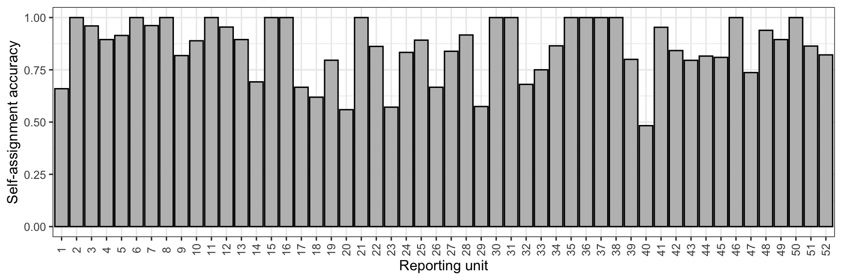 selfassprop%>%ggplot()+geom_bar(aes(x =reorder(ref_pops, -lat), y =prop_assigned_acc), stat ="identity", position ="dodge", color ="black", fill ="grey")+xlab("Reporting unit")+ylab("Self-assignment accuracy")+theme_bw()+theme(axis.text.x =element_text(angle =90, vjust =0.5), legend.position ="top")+scale_x_discrete(labels =c(1:52))