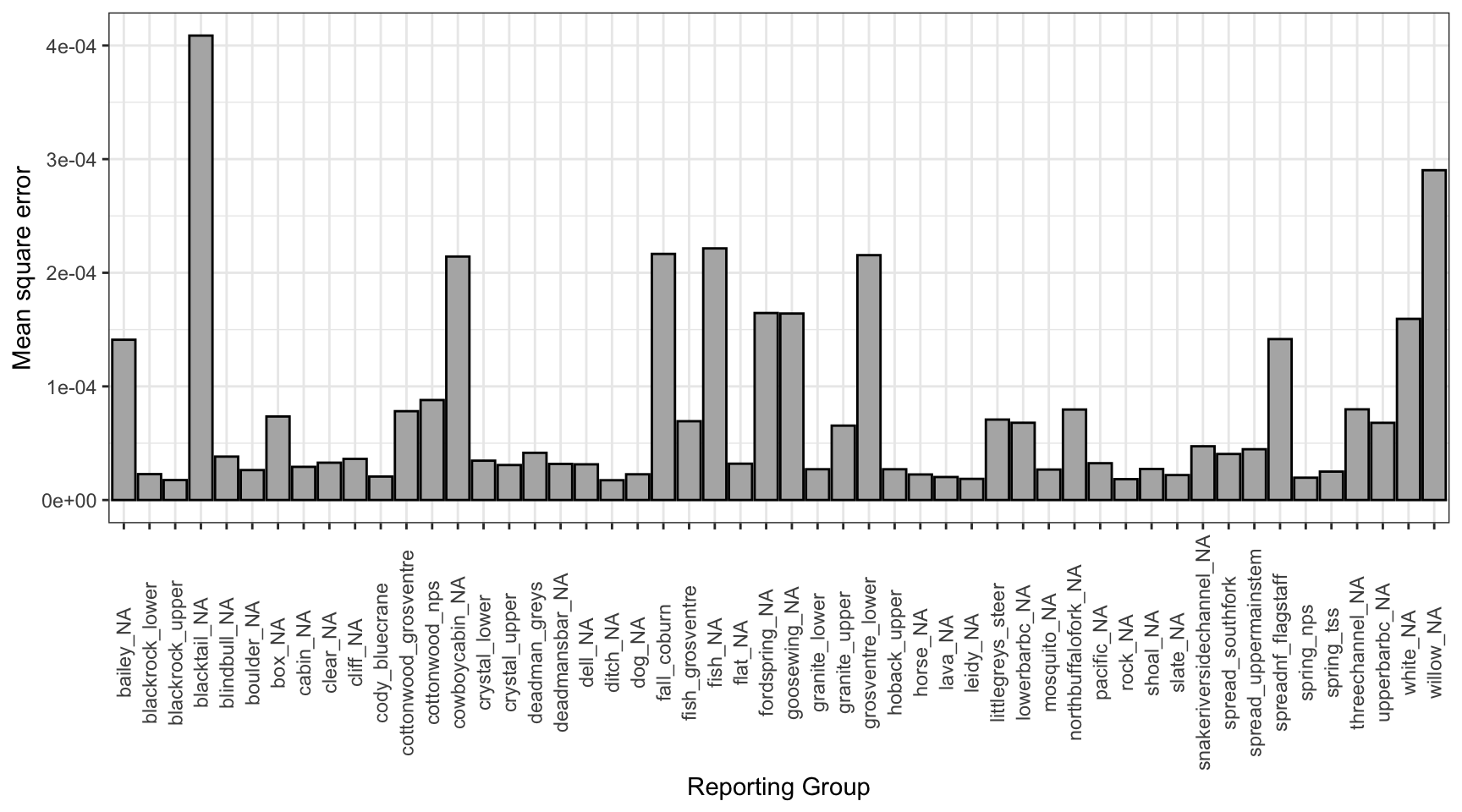 tmp0%>%ggplot()+geom_bar(aes(x =repunit, y =mse), stat ="identity", fill ="grey70", color ="black")+xlab("Reporting Group")+ylab("Mean square error")+theme_bw()+theme(axis.text.x =element_text(angle =90, vjust =0.5))