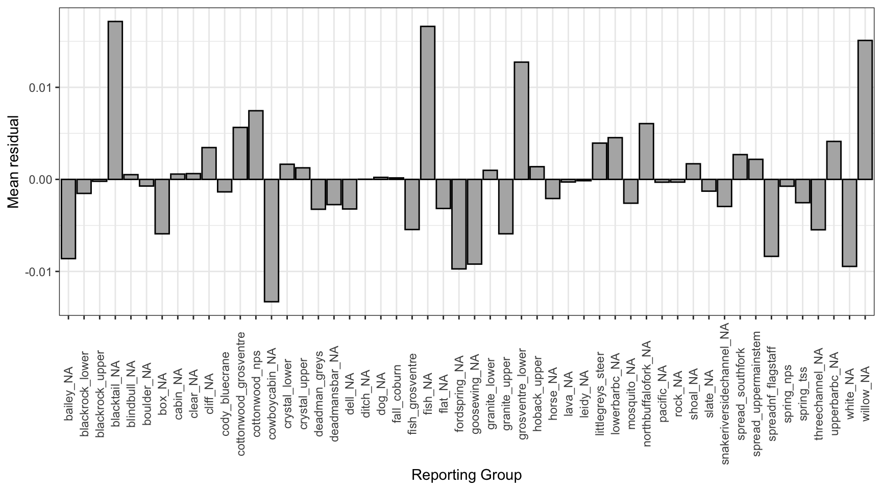 tmp0%>%ggplot()+geom_bar(aes(x =repunit, y =mr), stat ="identity", fill ="grey70", color ="black")+xlab("Reporting Group")+ylab("Mean residual")+theme_bw()+theme(axis.text.x =element_text(angle =90, vjust =0.5))