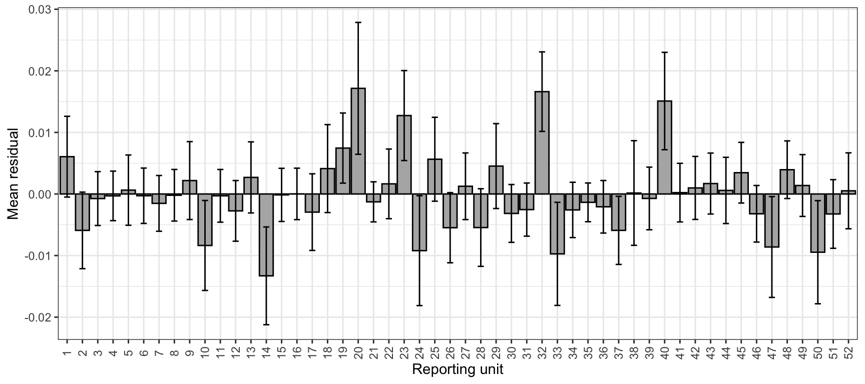Mean residual by reporting group (same as above), but numbered reporting groups with standard deviations